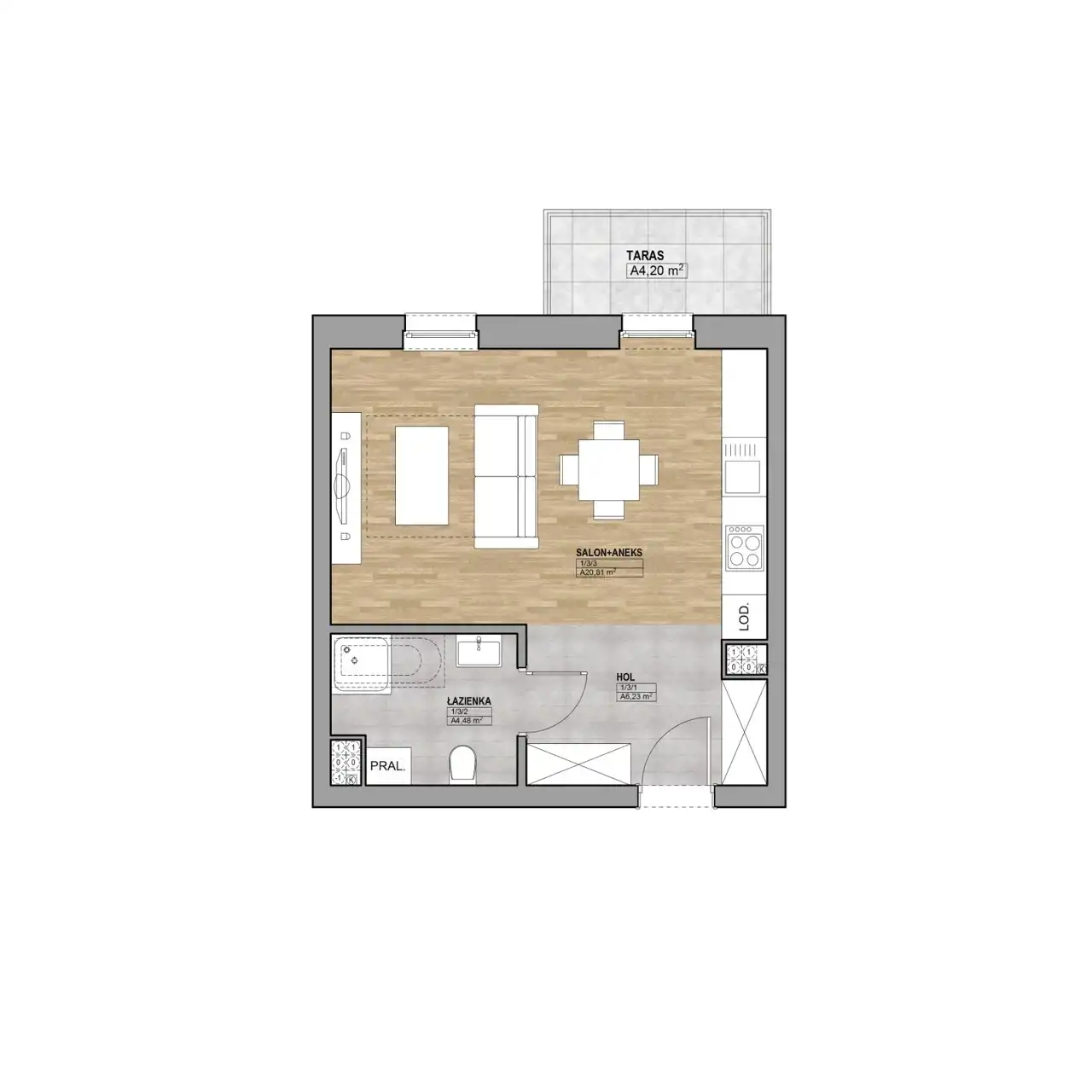Salon z aneksem kuchennym – 20,81 m²