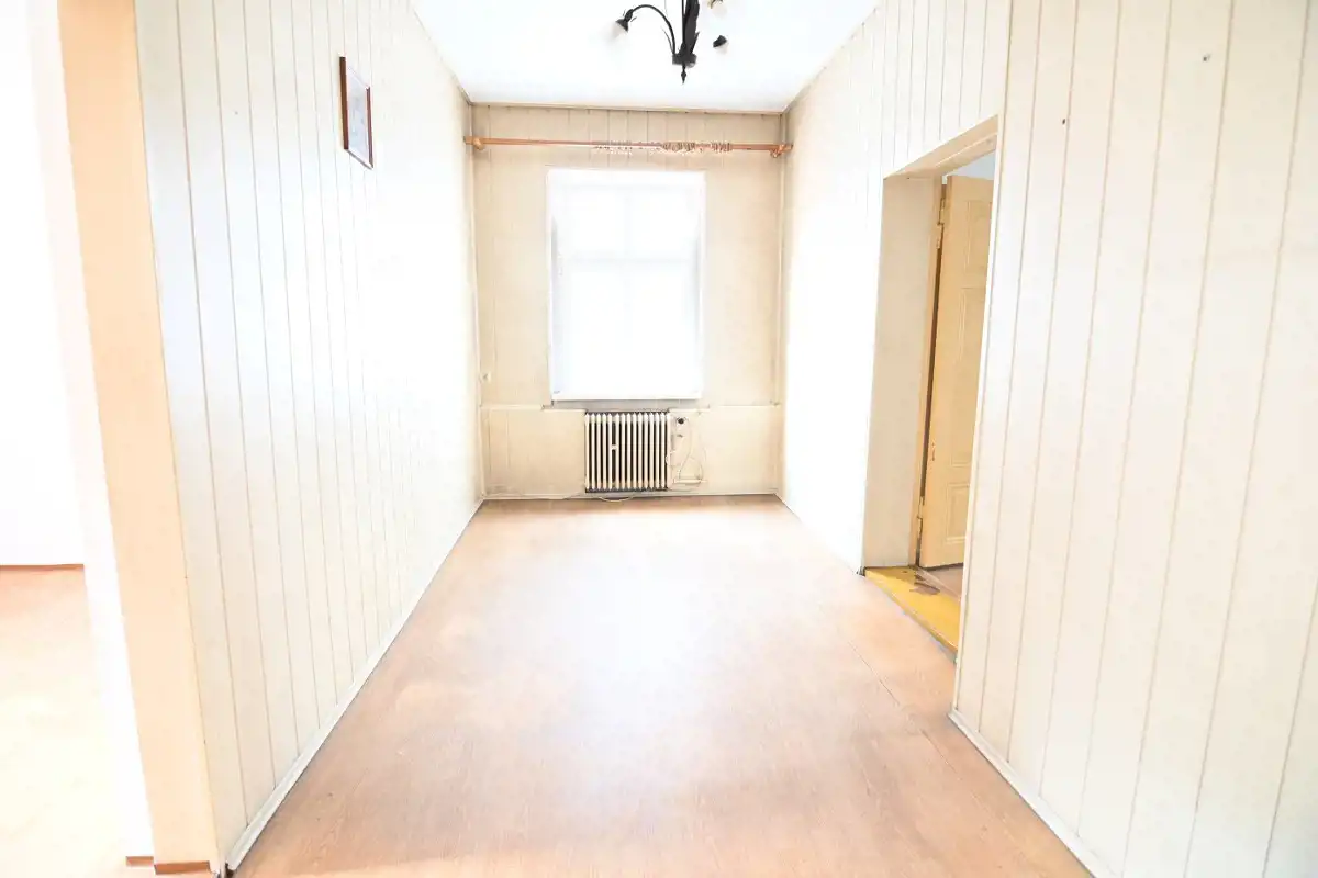 Składa się : 3 pokoi o pow. 12,54m2, 18,80 m2, 19,44 m2, kuchni z oknem (o pow. 9,02m2) i spiżarką 2,7 m2, łazienki z oknem (4,43 m2) oraz przedpokoju (z piecem na węgiel/drewno).