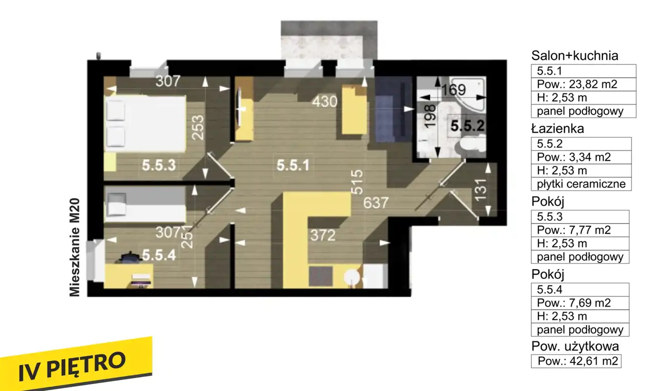 - Charakterystyka mieszkania 42.61 m2, 3 pokoje