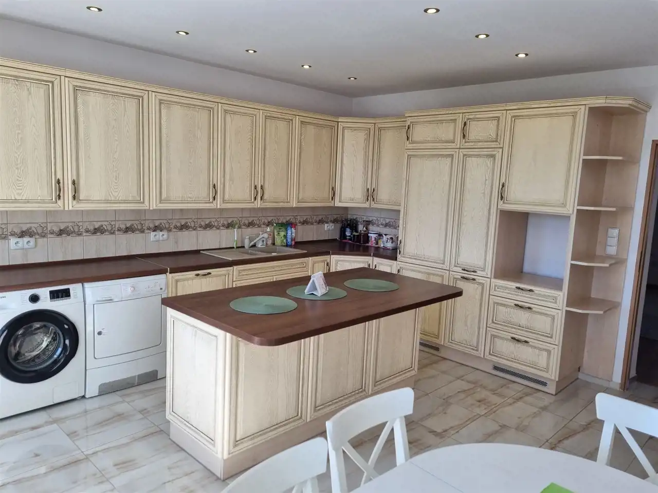 W pełni umeblowana dębowa kuchnia z wyspą. Sprzęt AGD: płyta, zmywarka marki Bosch, lodówka i suszarka marki Electrolux, pralka Samsung pozostają w cenie !!!