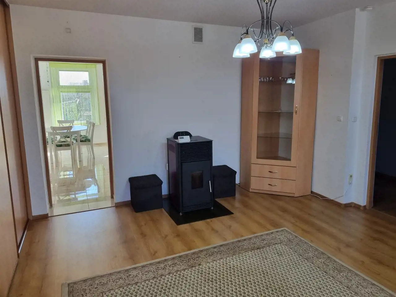 Salon z wyjściem do kuchni, zabudowany szafą typy Komandor.
