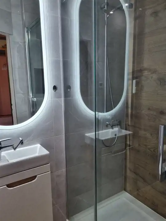 NOWA łazienka płytki, ogrzewanie podłogowe, kabina, bojler eklektyczny Ariston.
