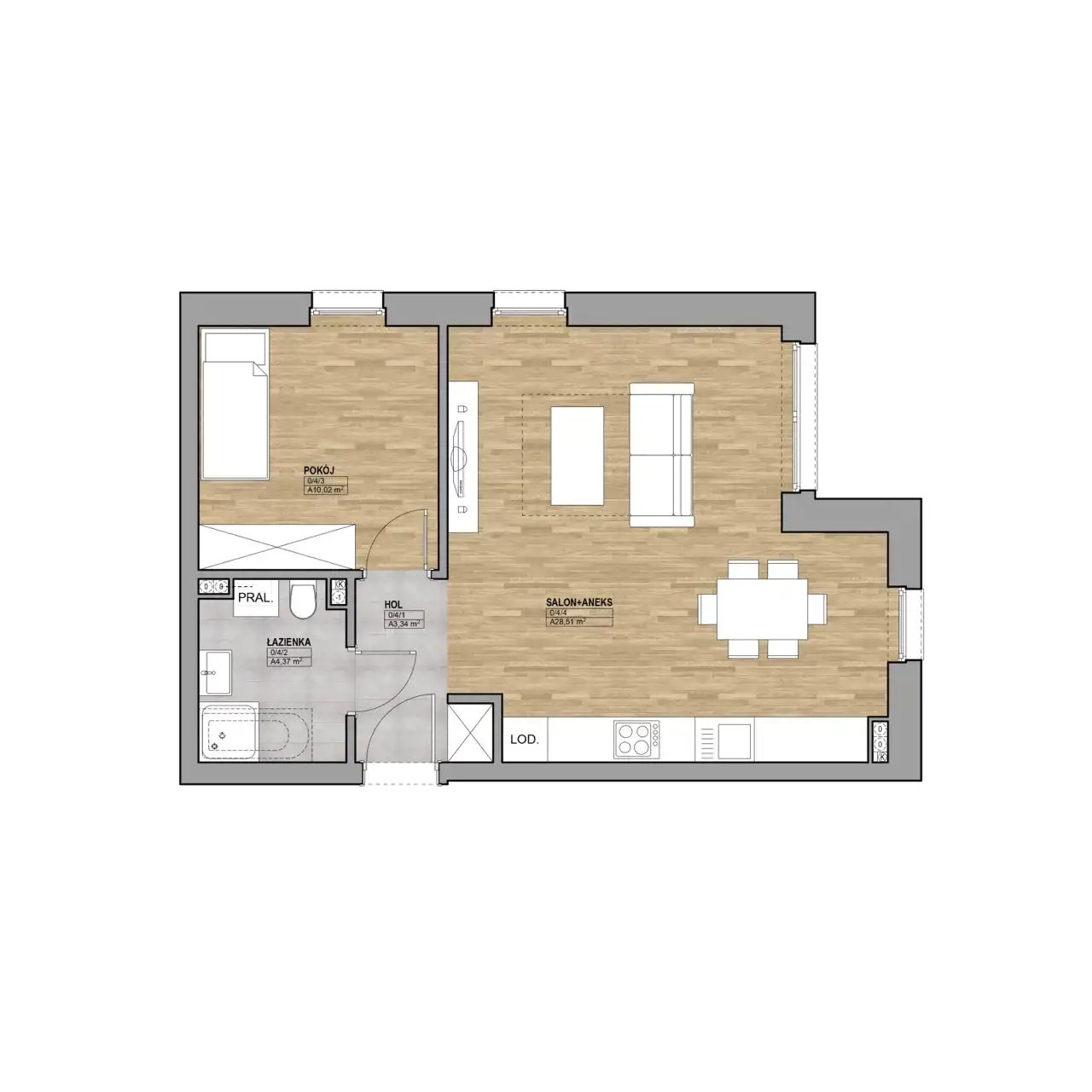 - Charakterystyka mieszkania 50.41 m2, 2 pokoje
