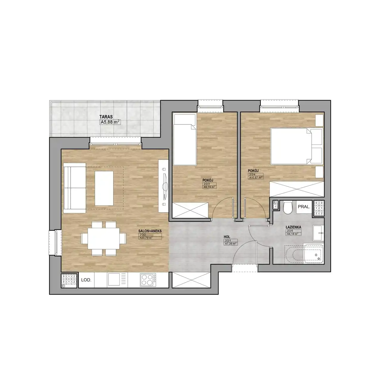 - Charakterystyka mieszkania 58.74 m2, 3 pokoje