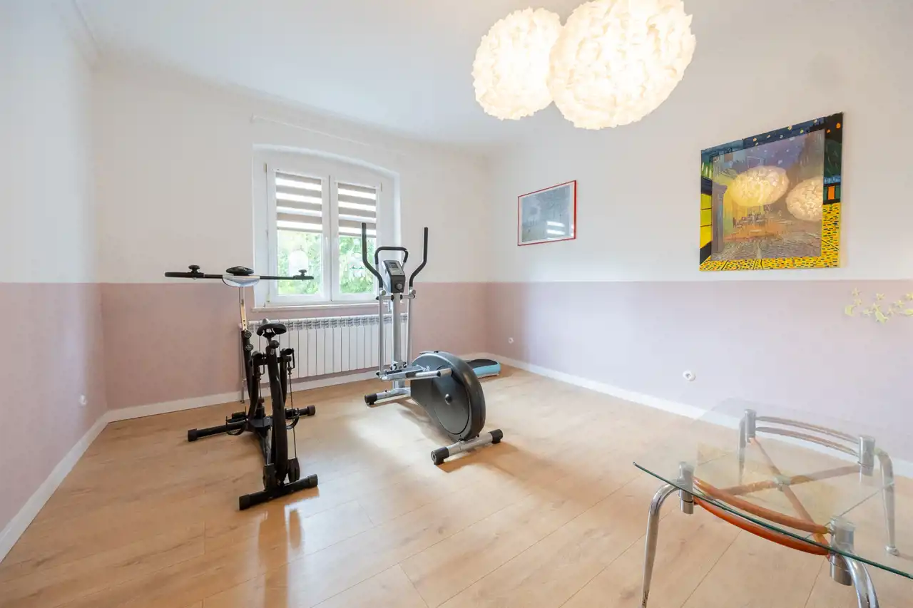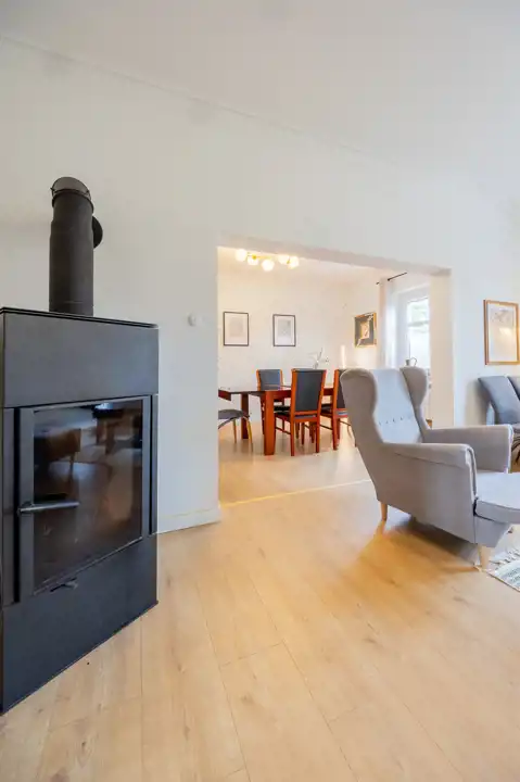 Ogrzewanie oraz ciepła woda pochodzą z miejskiej ciepłowni, co zapewnia stabilność kosztów eksploatacyjnych i wygodę użytkowania. Kominek stanowi nie tylko element dekoracyjny, ale również źródło ciepła i przytulnej atmosfery w chłodniejsze dni.