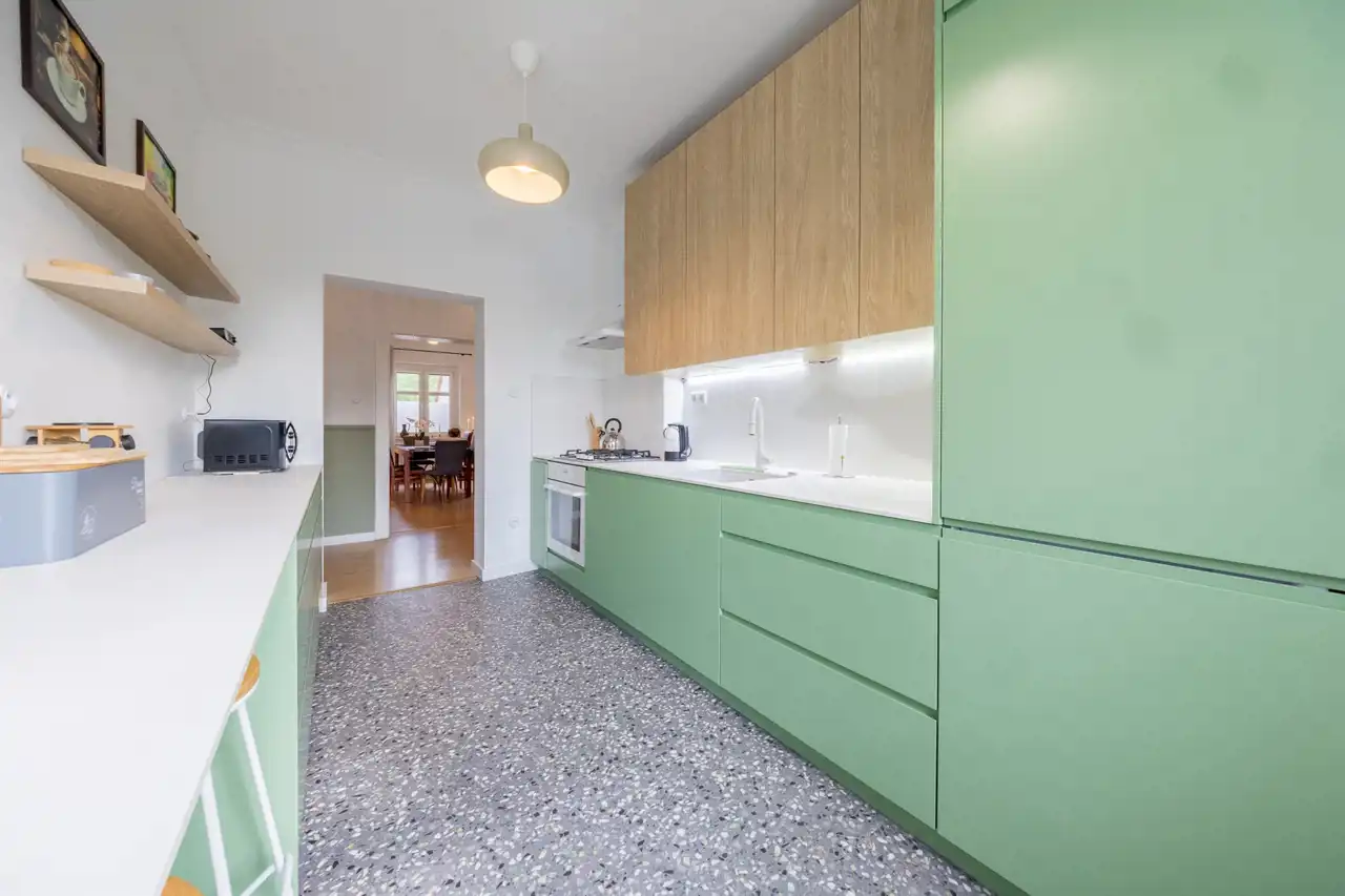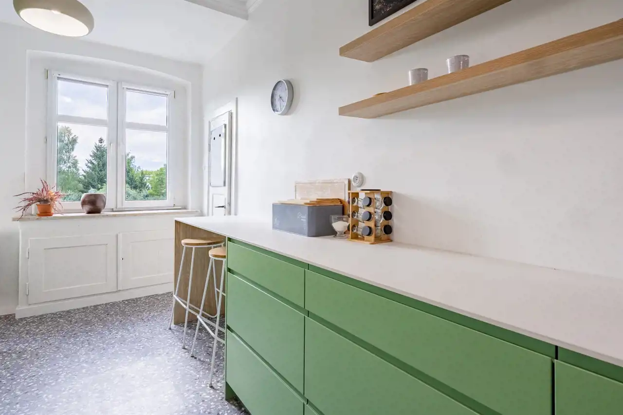 Mieszkanie znajduje się w stylowej kamienicy i oferuje imponującą wysokość pomieszczeń – aż 3 metry – co potęguje poczucie przestrzeni i światła. Układ wnętrza został zaprojektowany z myślą o wygodzie i ergonomii, a każdy metr kwadratowy został wykorzystany z maksymalną efektywnością.