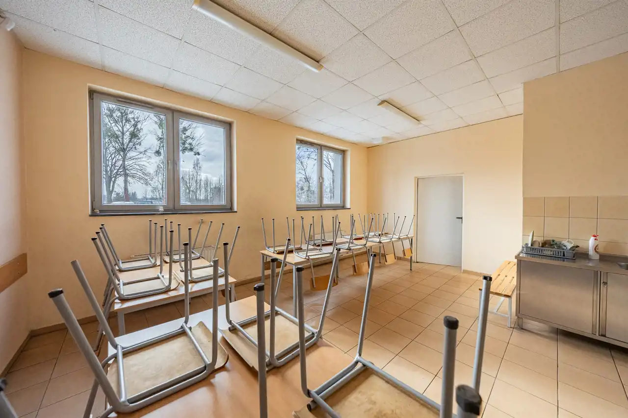 - Zaplecze socjalne: przestronne i jasne pomieszczenie z kuchnią