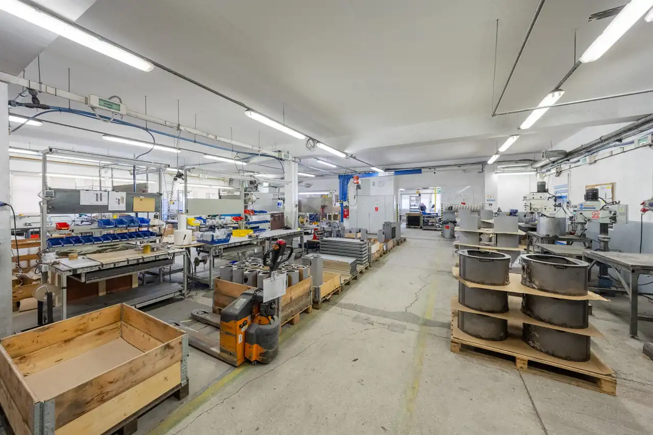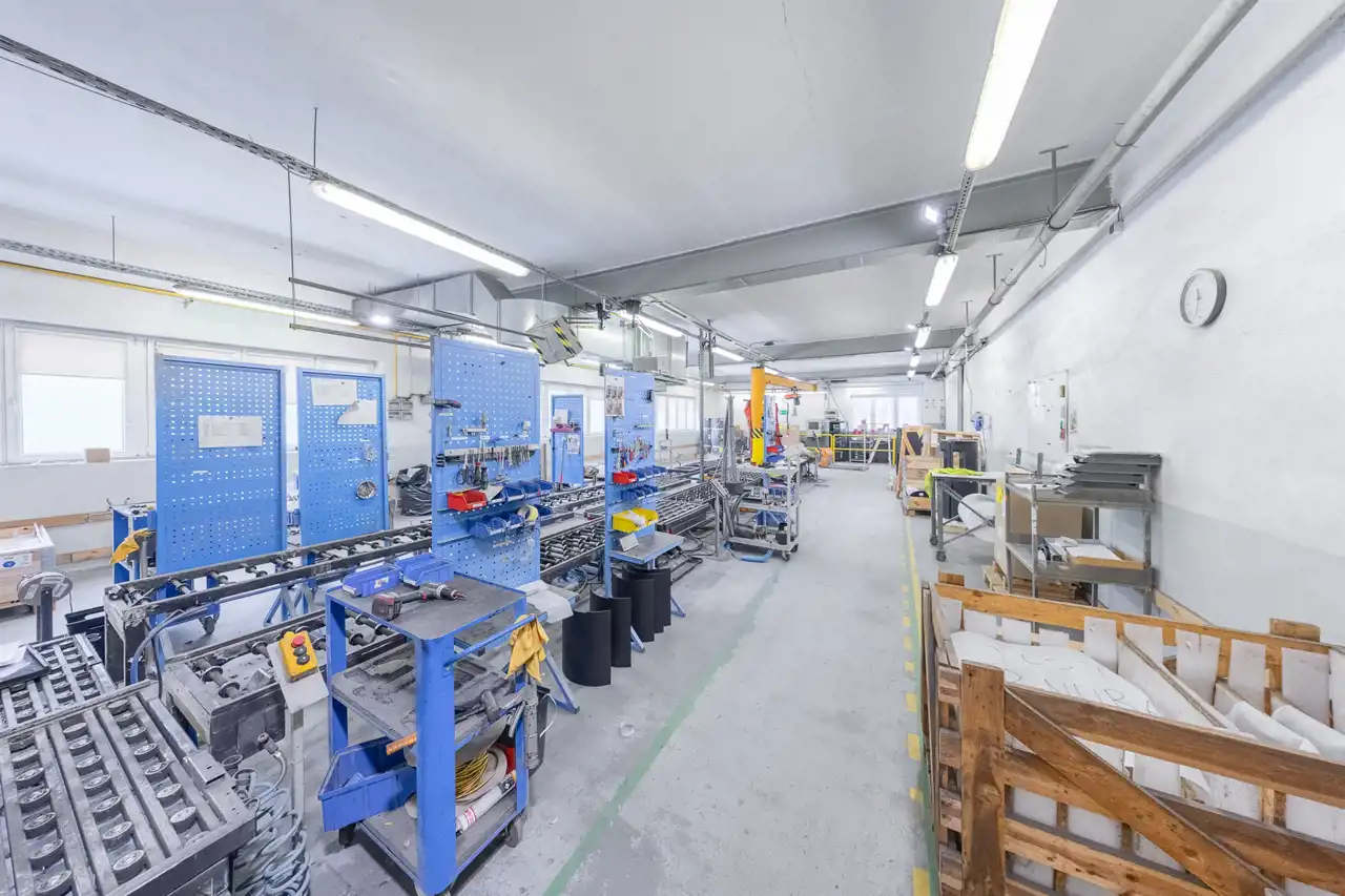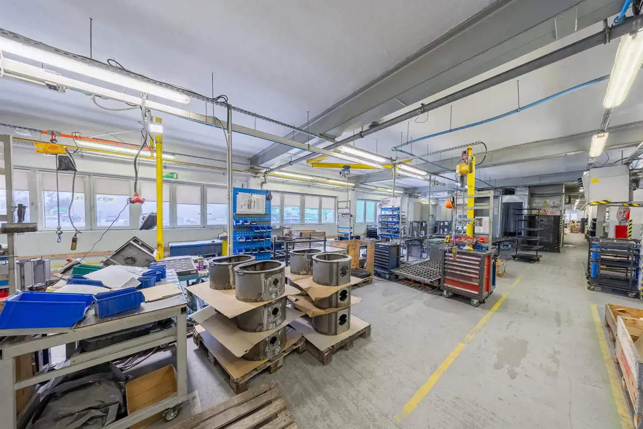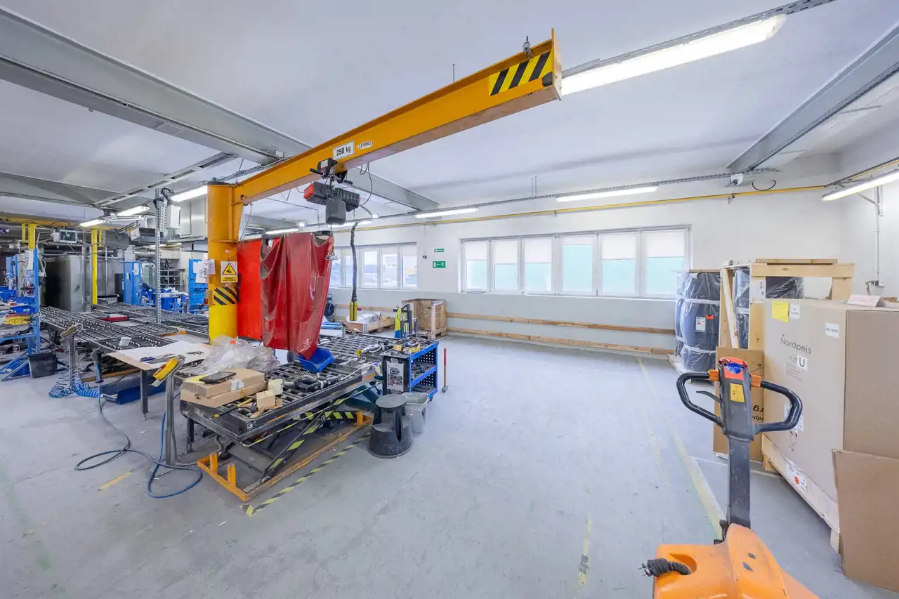 Infrastruktura techniczna hal: instalacja sprężonego powietrza, małe suwnice, regały wysokiego składowania, malarnia.