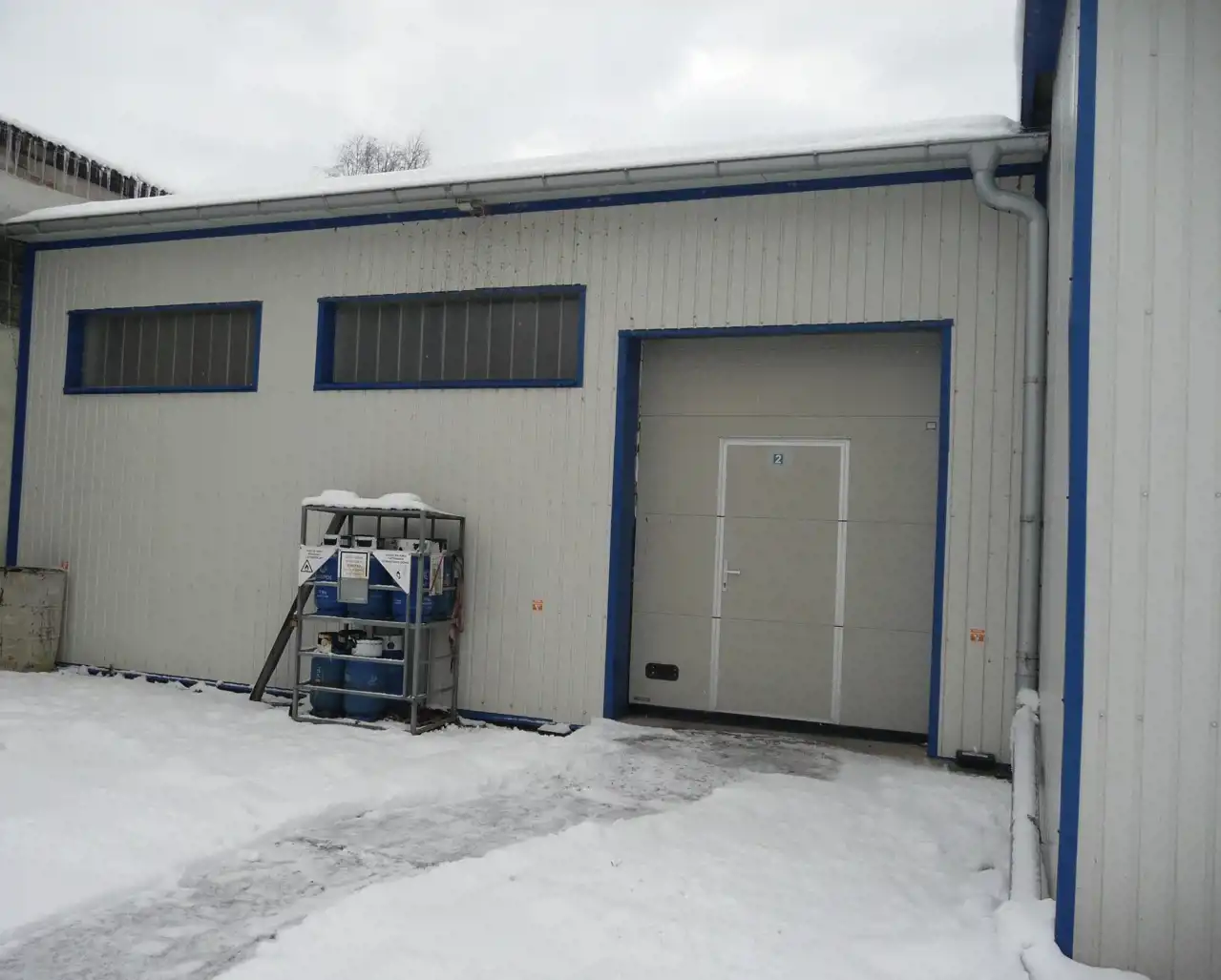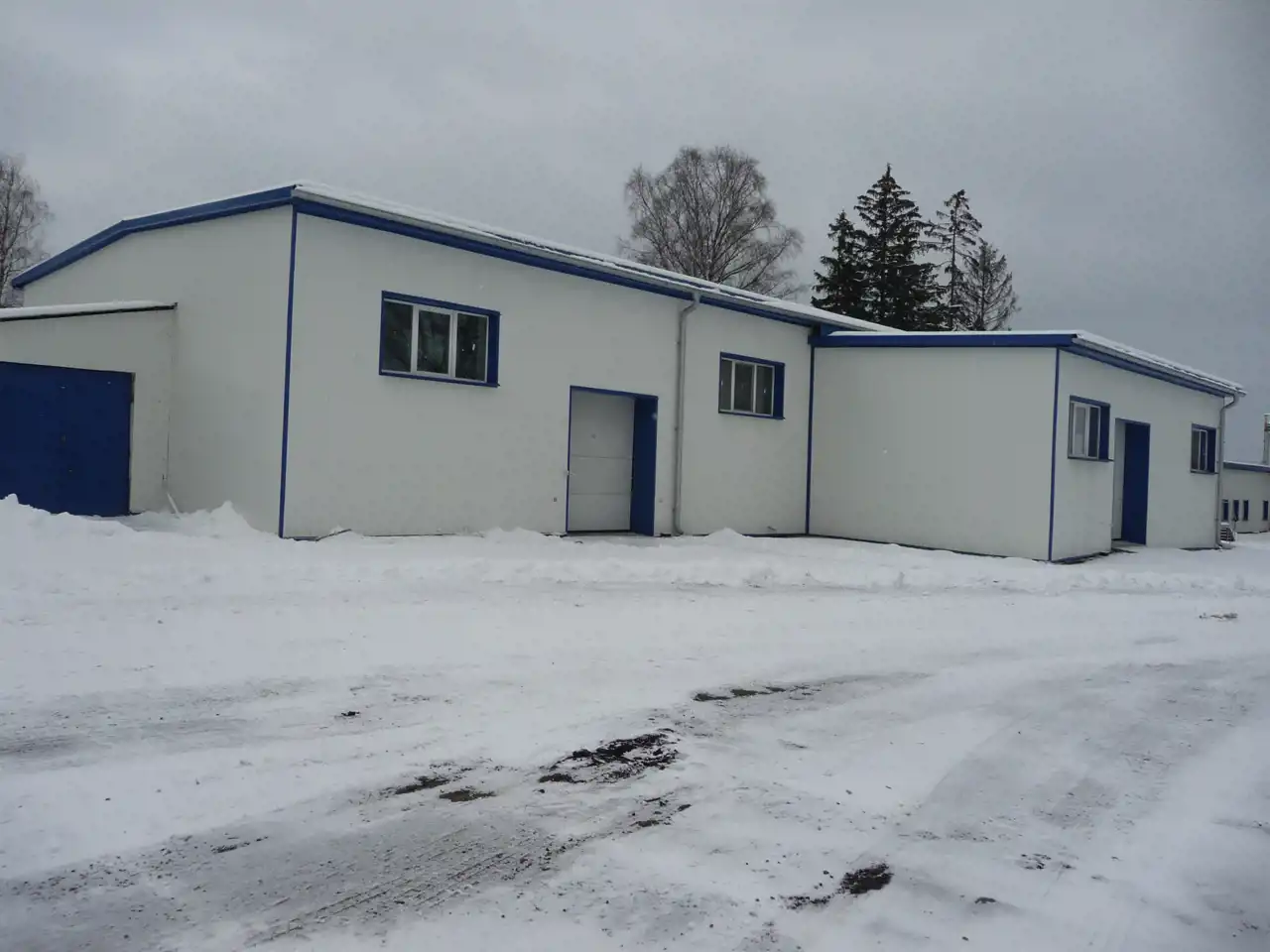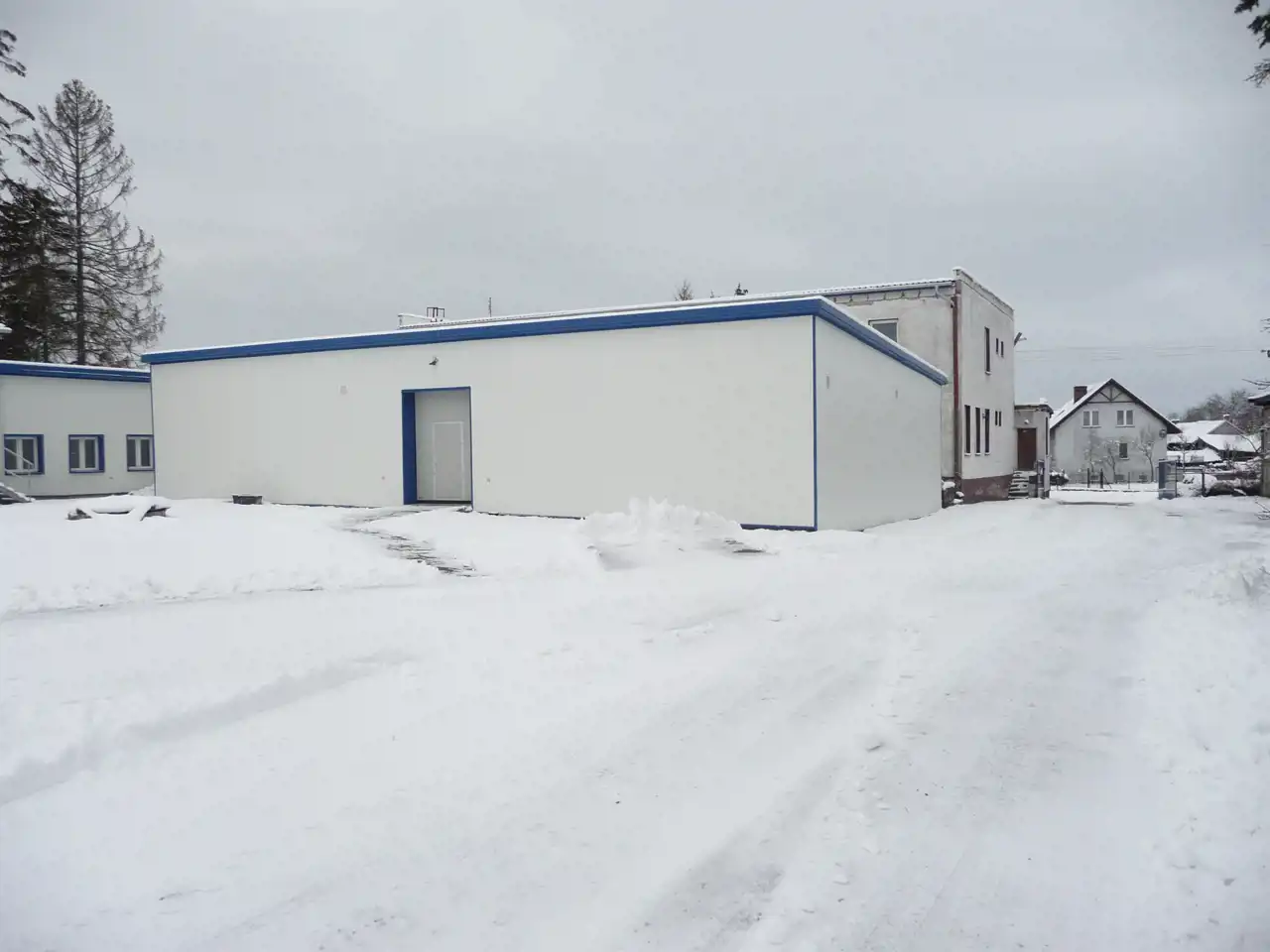 Największy powierzchniowo budynek składa się z czterech pomieszczeń magazynowych oraz zaplecza socjalnego tj. biura, wc, łazienki,szatni, jadalni i kotłowni.