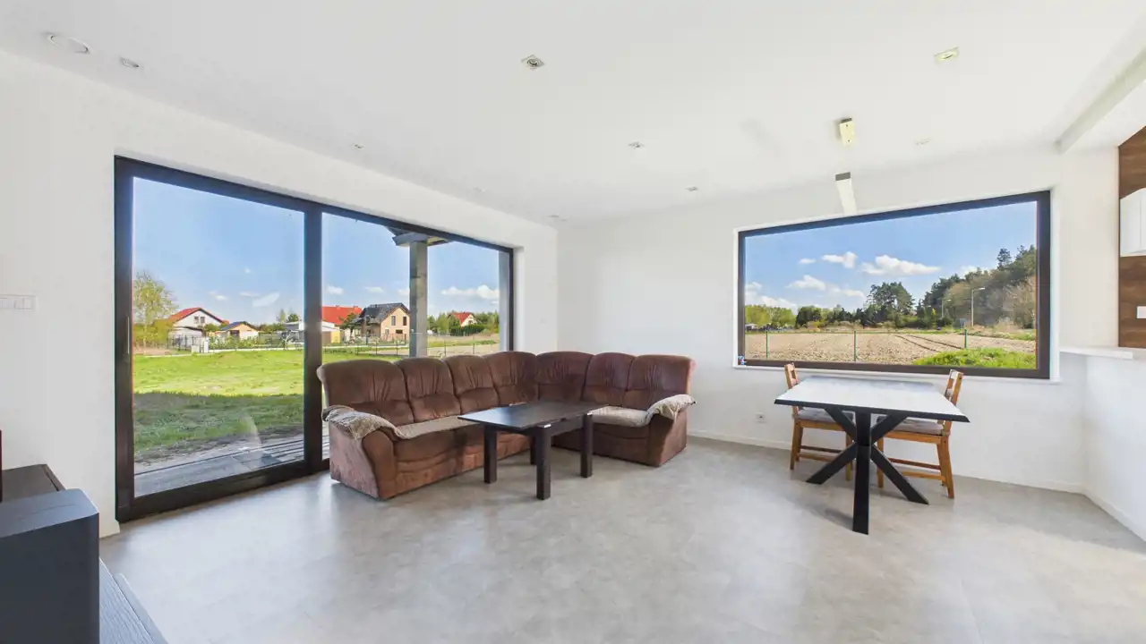 - otwarty salon z kuchnią i jadalnią oraz wyjściem na ogród