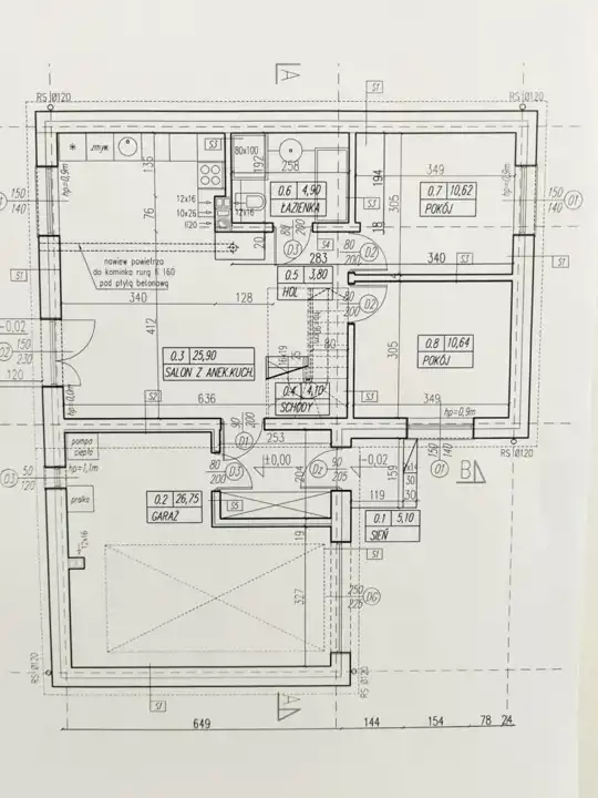Parter składa się z salonu z kuchnią w aneksie o powierzchni 25,90 m.kw, łazienki z wc o pow. 4,90 m.kw, dwóch sypialni o pow. 10,64 m.kw + 10,62 m.kw, hallu o pow. 3,80 m. kw, sieni o pow. 5, 10 m.kw oraz garażu o pow. 26, 75 m.kw. Poddasze użytkowe, o powierzchni 25, 04 m.kw do własnej aranżacji. Na tym etapie prac możliwe dostosowanie pomieszczeń na potrzeby kupującego.