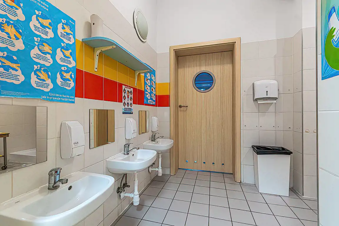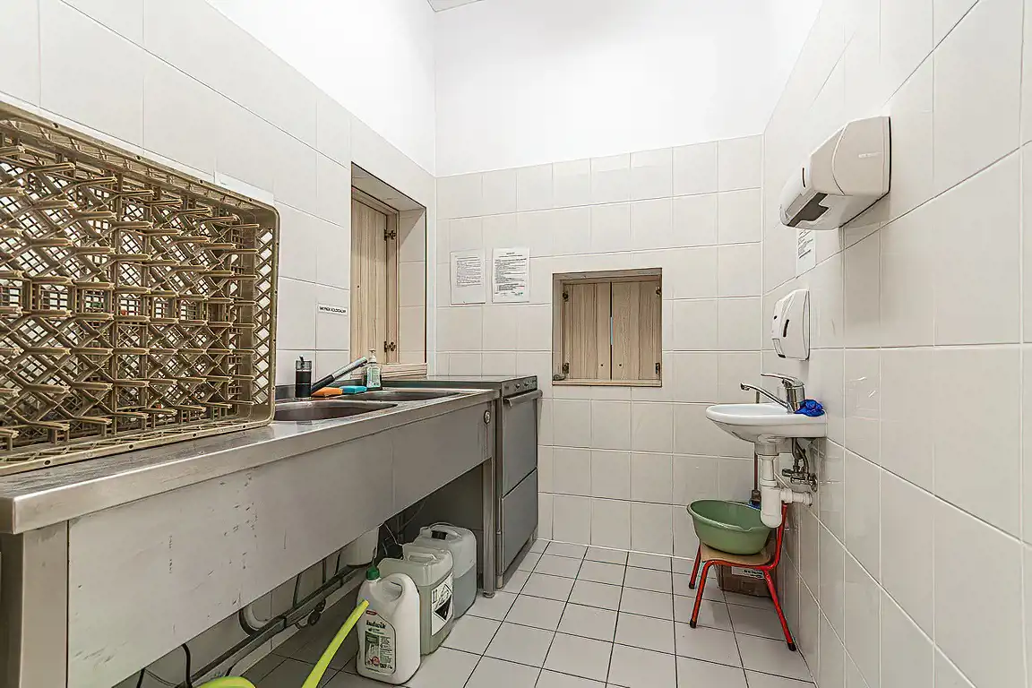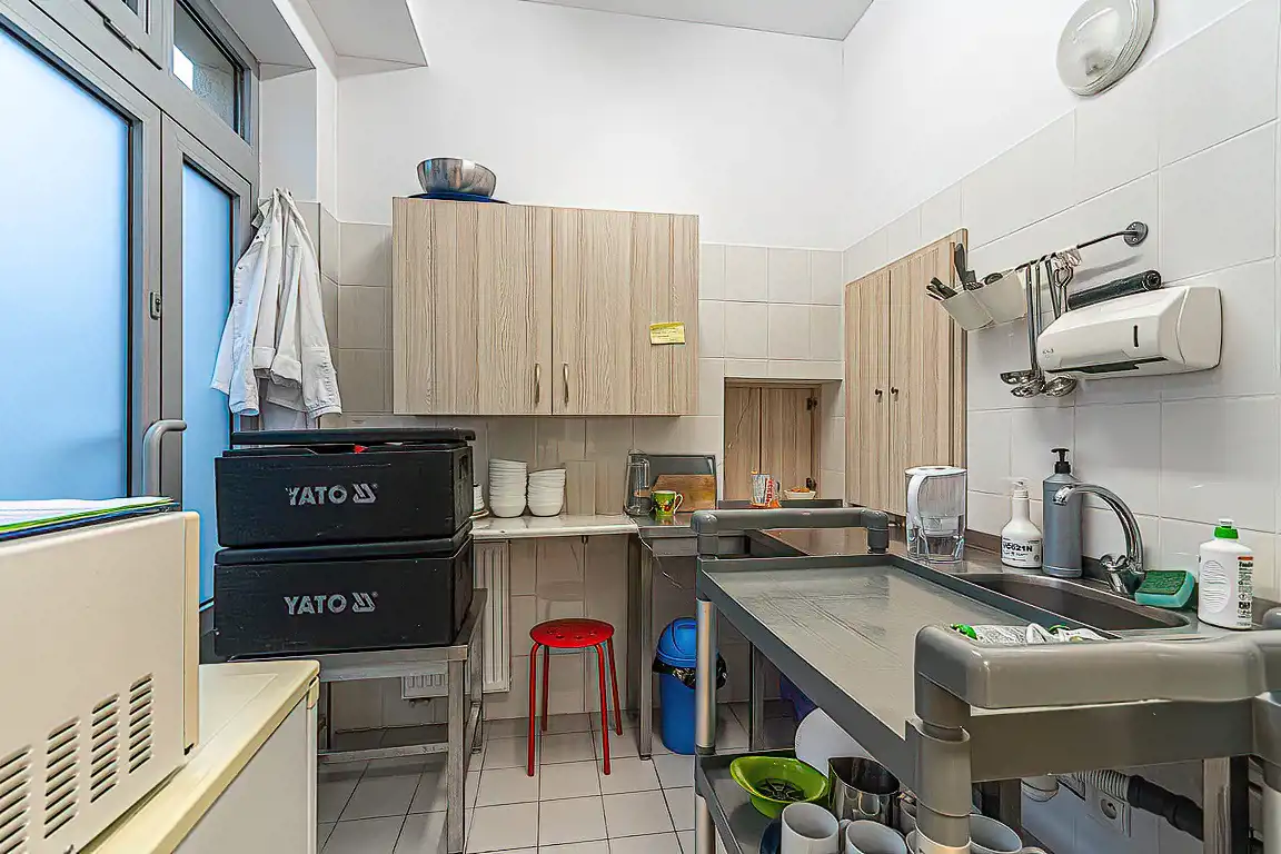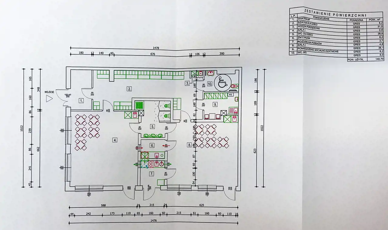 Powierzchnia lokalu wynosi 140,05 m2, składa się z dwóch dużych sal (36 i 39 m2) oraz powierzchni dodatkowych takich jak: szatnia, 2x WC, biuro, pomieszczenie do wydawania posiłków i miejsca do mycia naczyń. Rzuty i powierzchnie pomieszczeń załączone są na ostatnim zdjęciu.