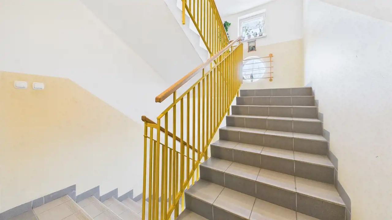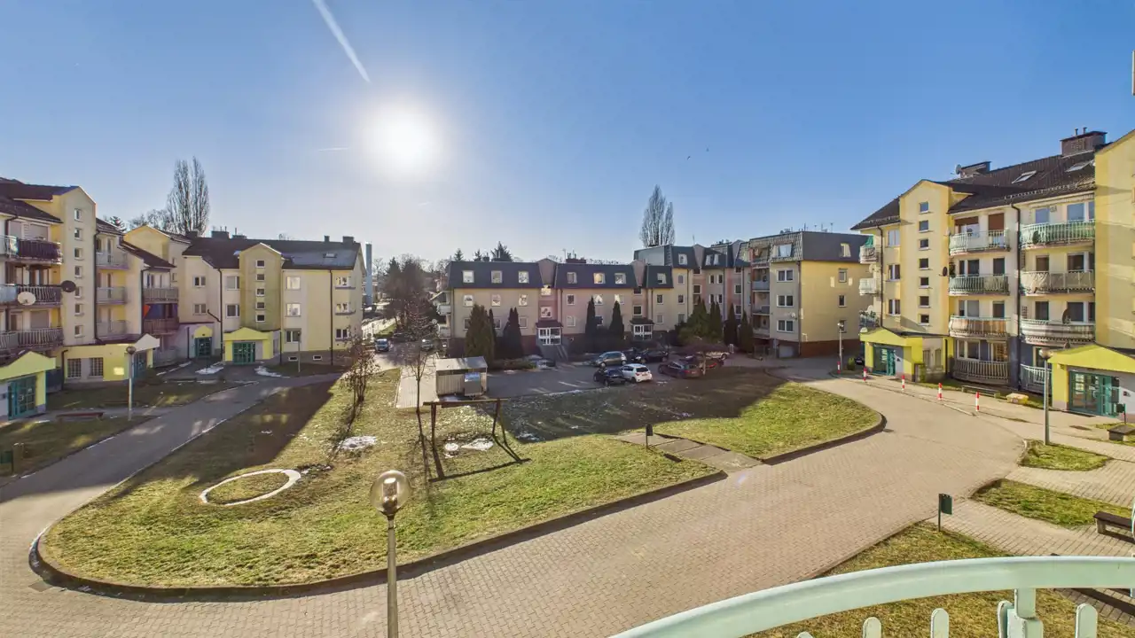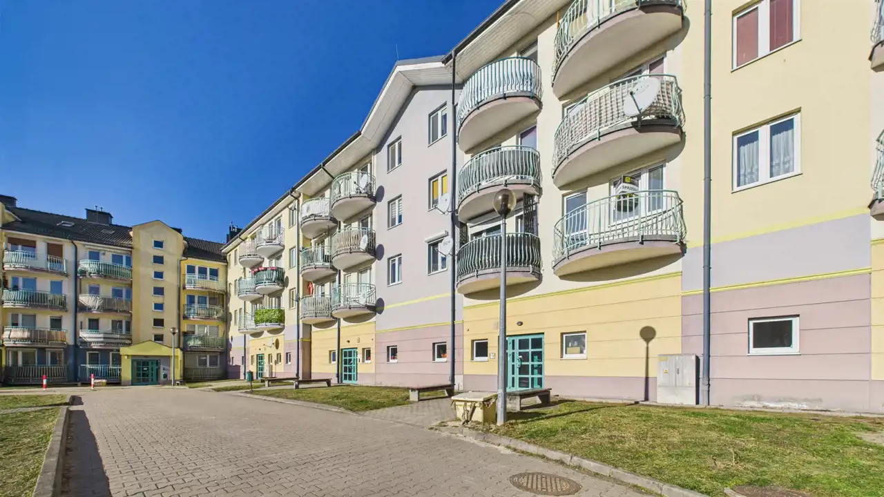 Mieszkanie ma powierzchnię 36 m2 + balkon 3,2 m2 i znajduje się na pierwszym piętrze w 4-piętrowym budynku.