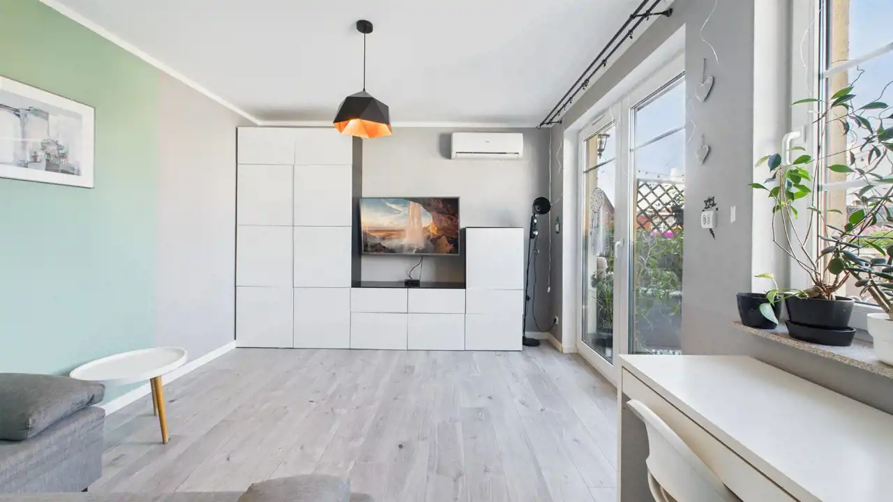 Mieszkanie jest wyposażone (większość mebli zostaje), zamontowana została klimatyzacja służąca w ciepłe dni, a ogrzewanie zapewnia piec dwufunkcyjny gazowy (ogrzewanie podłogowe). W dwóch oknach rolety zewnętrzne. Dostępny Internet światłowodowy.