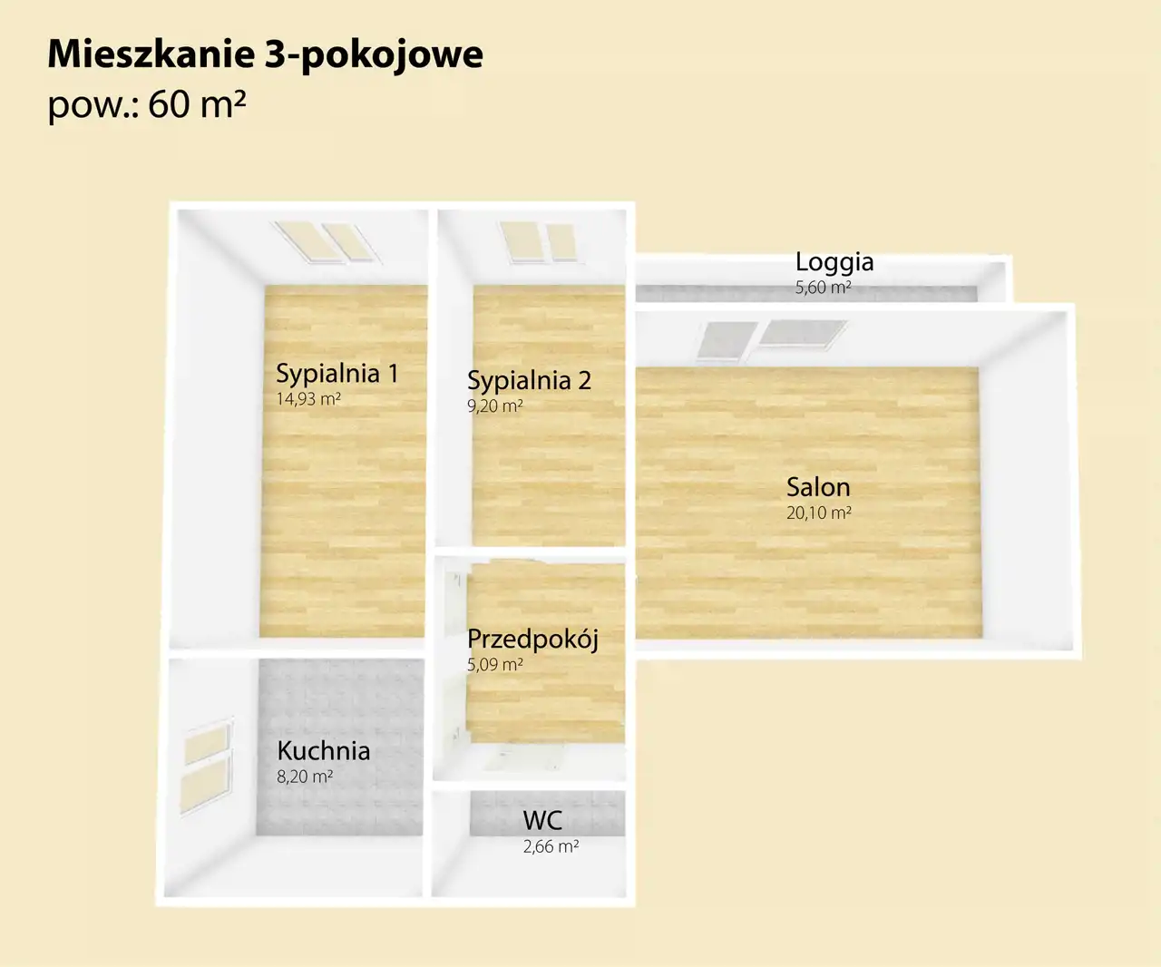 - Charakterystyka mieszkania 60 m2, 3 pokoje