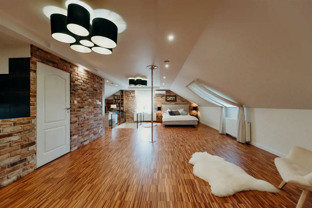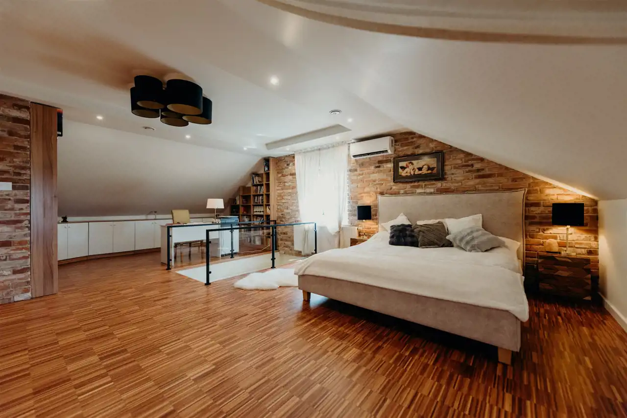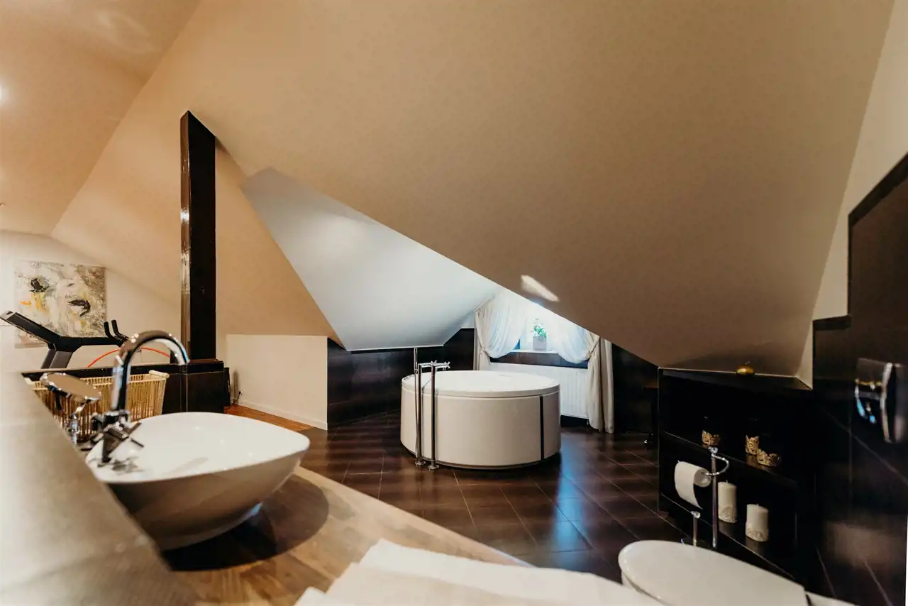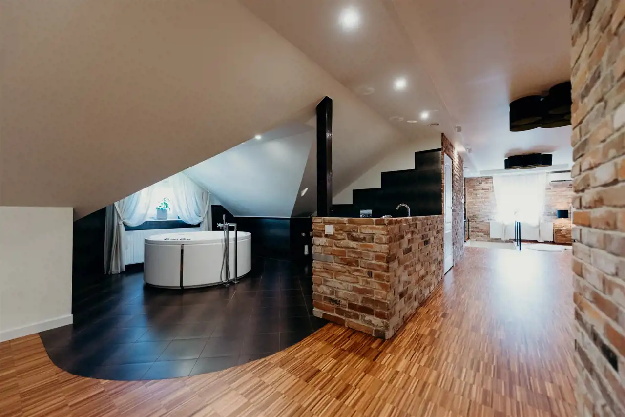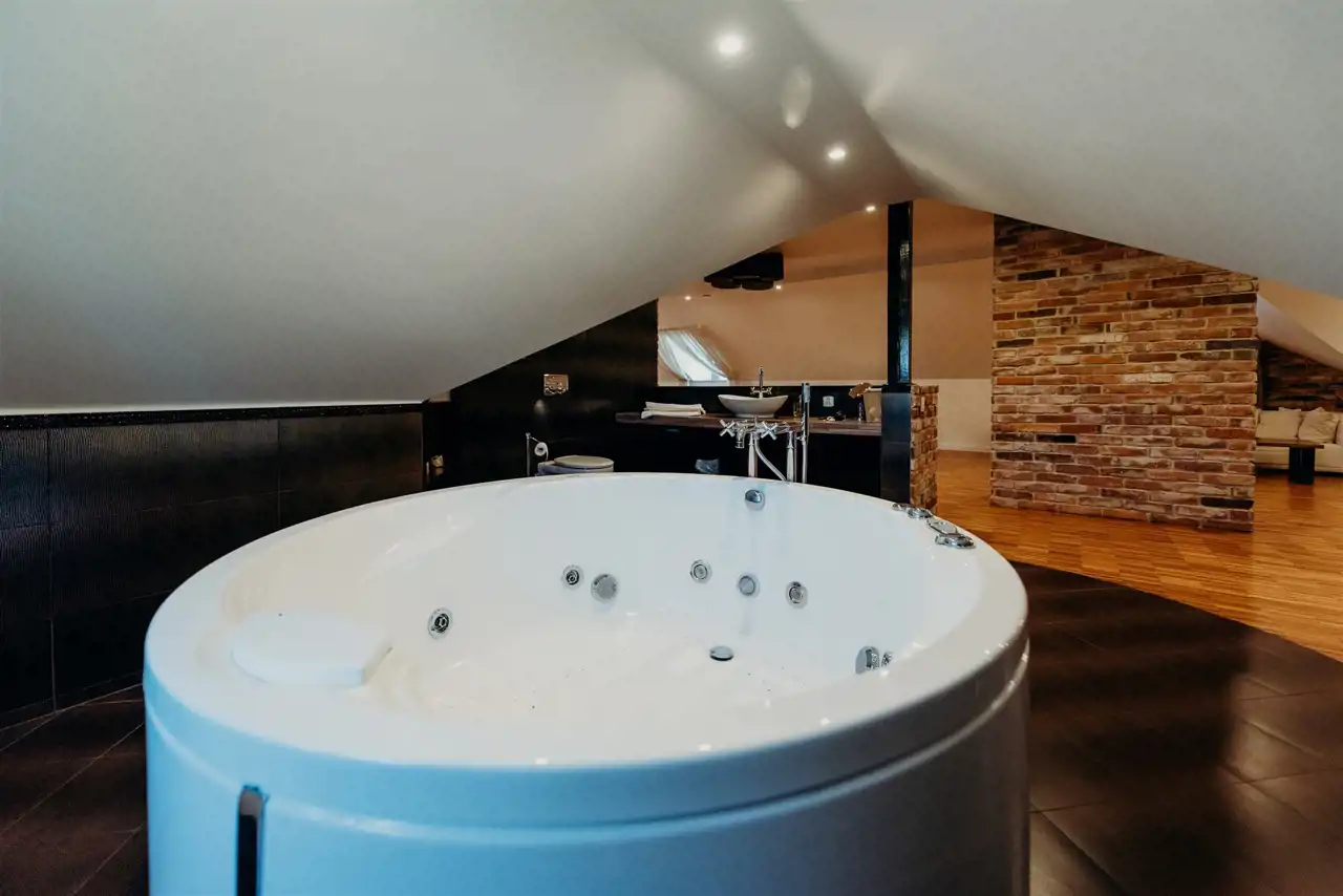 - otwarta przestrzeń w której mamy część biurową, sypialnianą, wypoczynkową oraz otwartą łazienkę z okrągłym jacuzzi