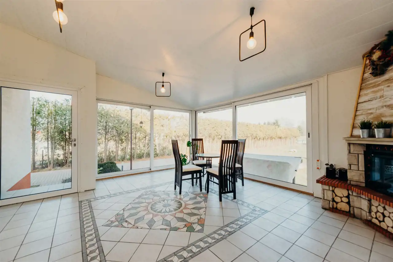 - Przestronny ogród zimowy (25 m²) z kominkiem