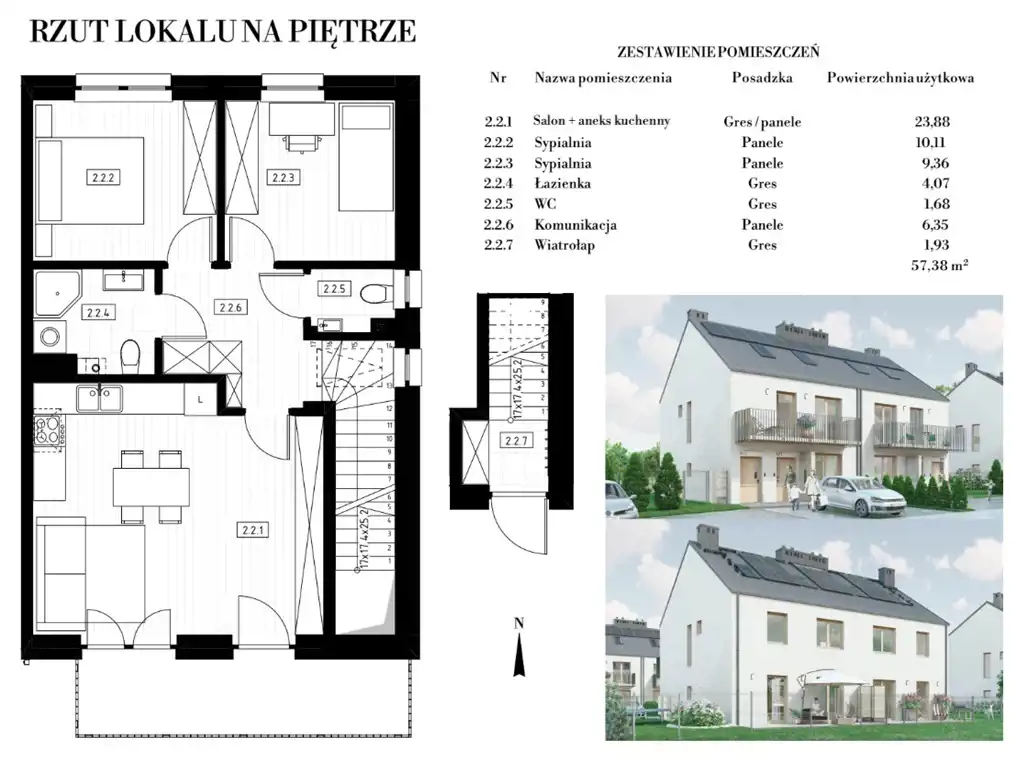 Razem powierzchnia: 57,38 m2 + poddasze 26,68 m2
