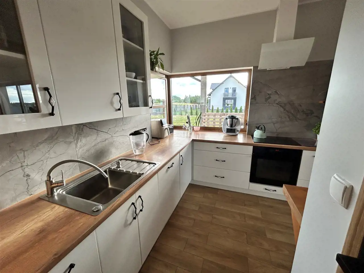 Nieruchomość wybudowana w roku 2017 (zakończenie budowy rok 2023) z materiałów najwyższej jakości z garażem dwustanowiskowym w bryle budynku o powierzchni aż 31 m2 zamykany bramą segmentową sterowaną z pilota. Z zewnątrz nieruchomość okala zadaszony taras od strony północnej i zachodniej, co tworzy bardzo dużą przestrzeń wypoczynkowo-rekreacyjną. Przestrzeń pod tarasem jest zabudowana co stanowi odrębne miejsce do przechowywania. Nie posiada ona bezpośredniego przejścia do domu dzięki czemu można wykorzystać ją chociażby jako schowek na narzędzia i sprzęt ogrodniczy.