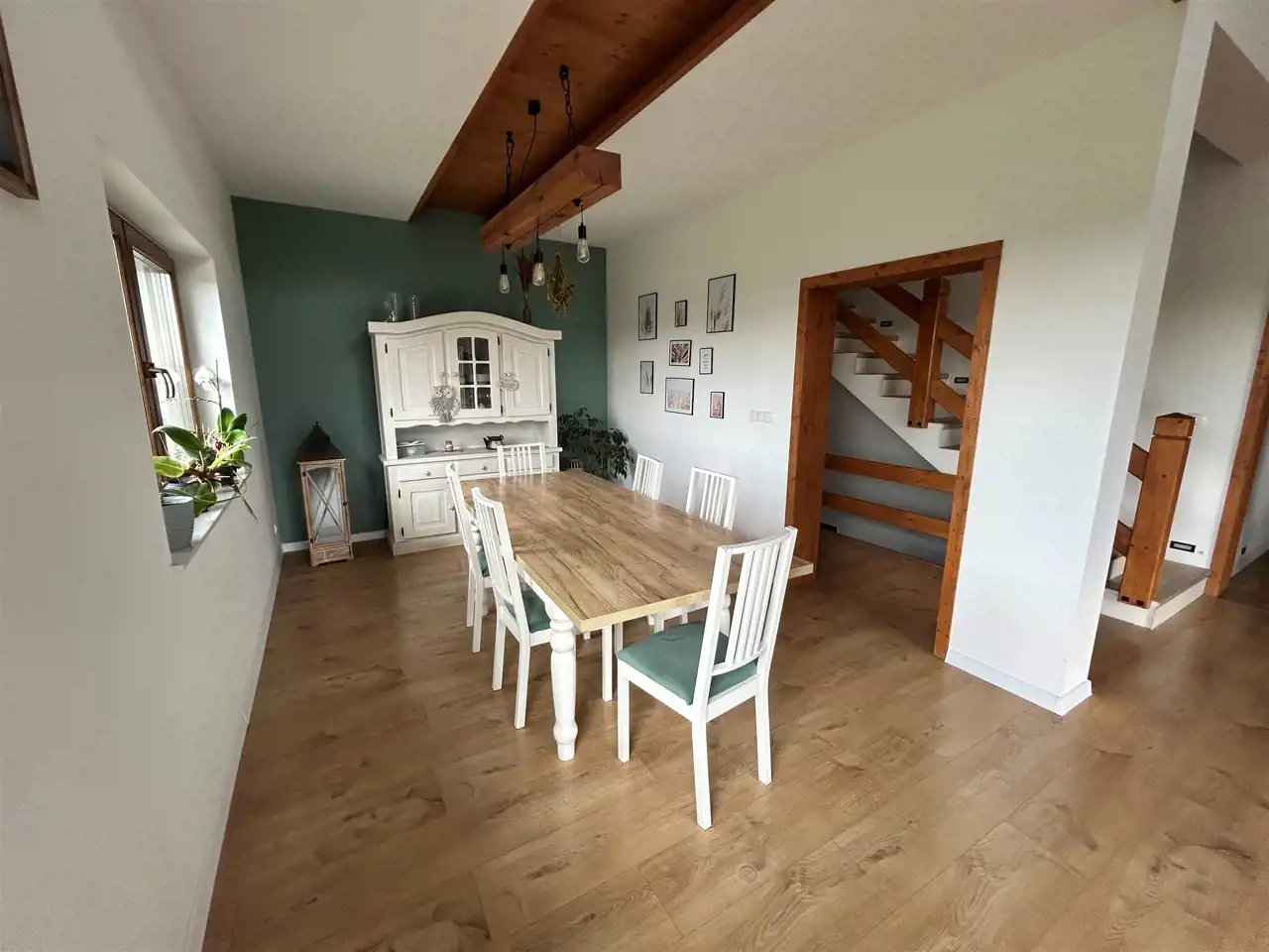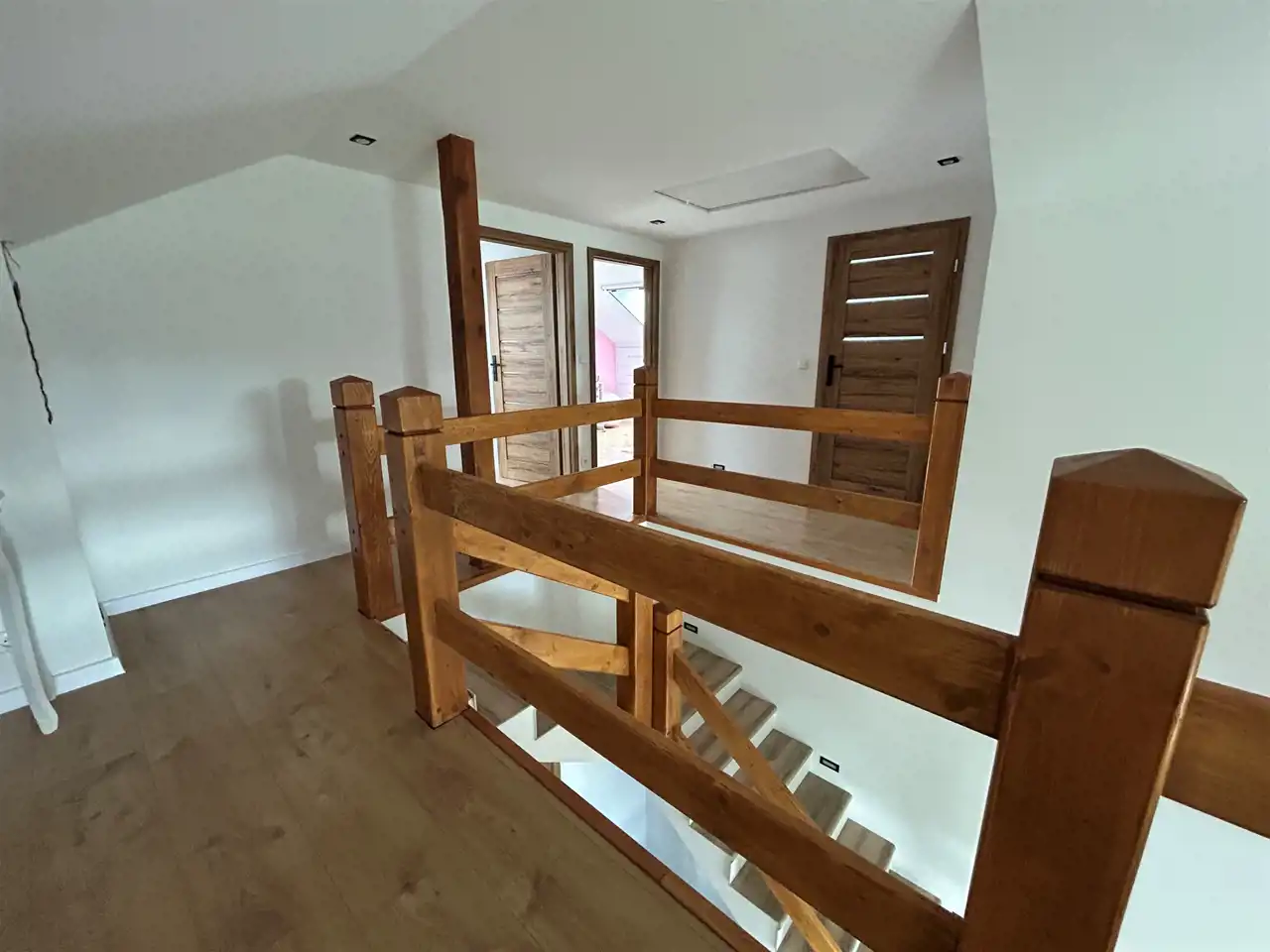 - Ogrzewanie domu stanowi piec dwufunkcyjny na pellet wraz z zasobnikiem CWU o pojemności 150 litrów. Na parterze budynku znajduje się ogrzewanie podłogowe (w sypialni kaloryfer), na piętrze kaloryfery.