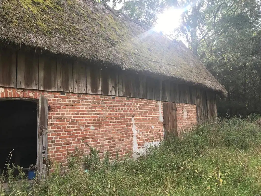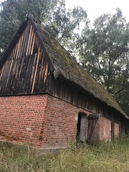 Na działce znajduje się rozpoczęta budowa domu, budynek z czerwonej cegły oraz drewutnia.