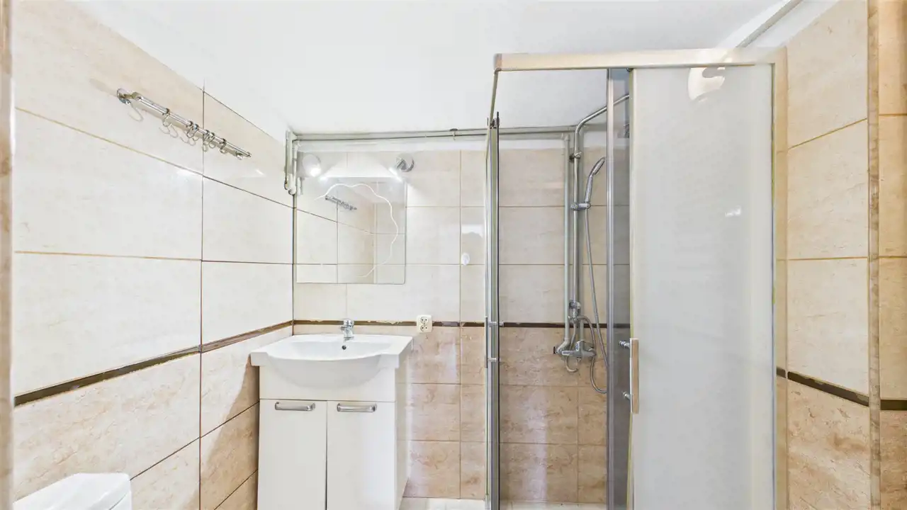 * łazienka z wc i kabiną prysznicową, kafle starszego typu,