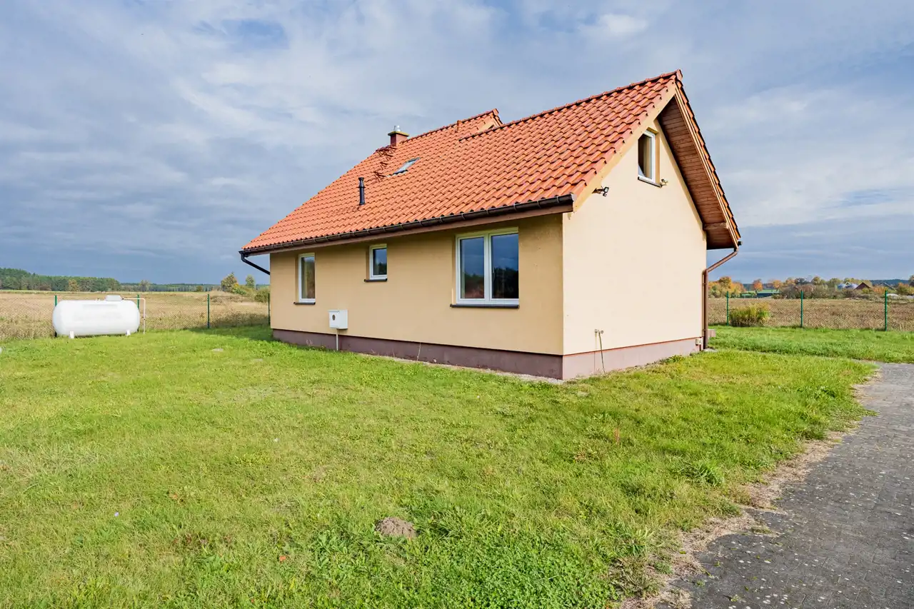 Budynek wolnostojący, parterowy z poddaszem użytkowym, niepodpiwniczony. Dach dwuspadowy, pokryty dachówką ceramiczną. Nieruchomość jest podłączona do sieci wodociągowej i energetycznej. Ogrzewanie domu zapewnia piec gazowy dwufunkcyjny z zamkniętą komorą spalania. Gaz ze zbiornika zewnętrznego.