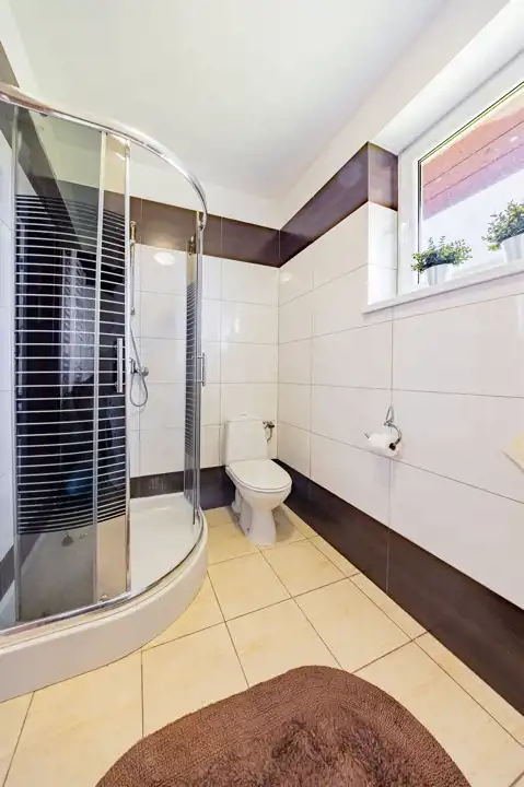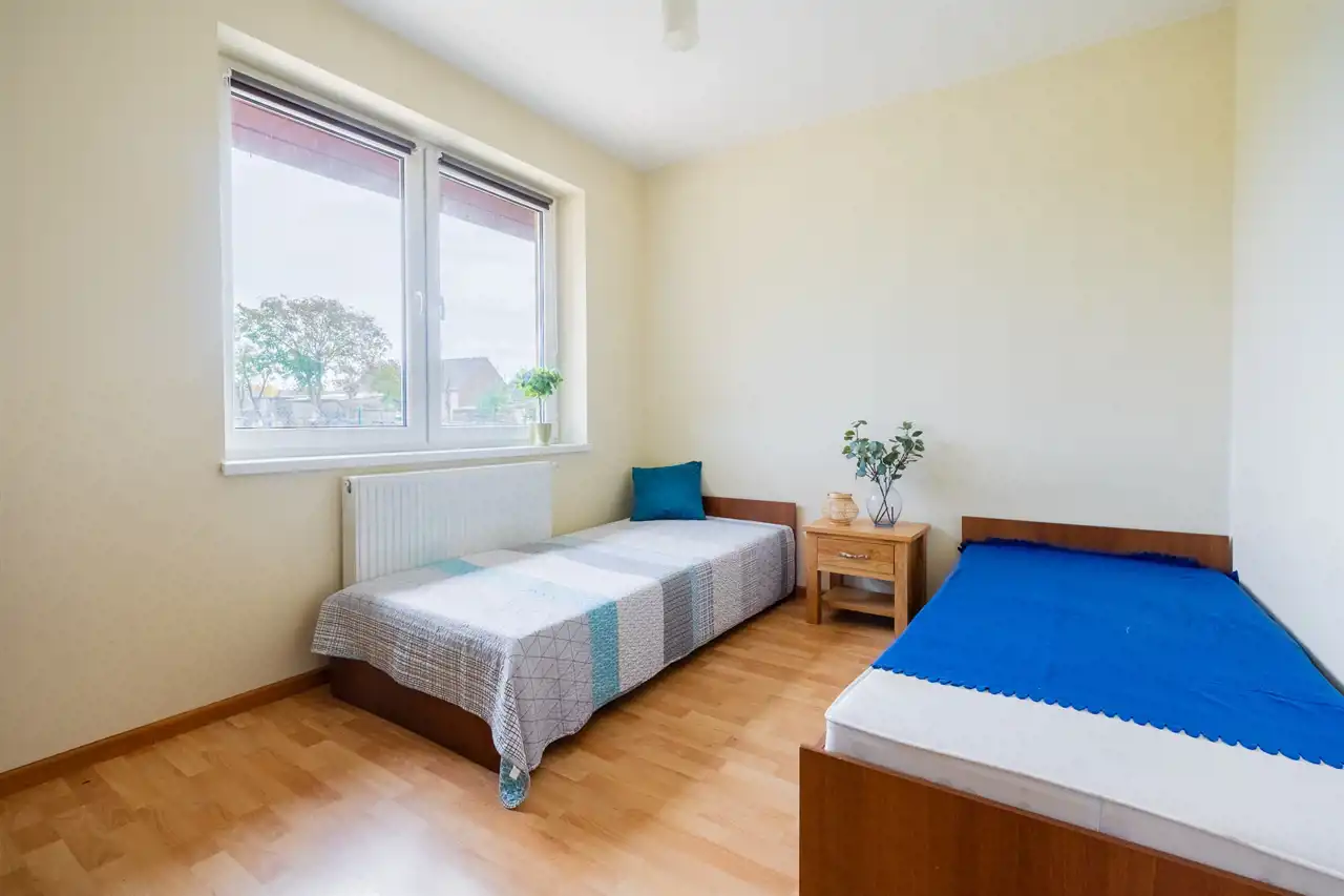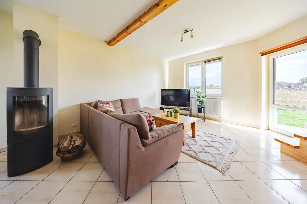 Znajdują się tu: przestronny salon z aneksem kuchennym, dwie przytulne sypialnie, łazienka z prysznicem oraz praktyczny wiatrołap. W salonie znajduje się piec kominkowy typu koza, opalany drewnem, który wprowadza wyjątkowy klimat i ciepło w chłodniejsze dni. Na podłogach płytki, w sypialniach panele. Okna PCV wyposażone w rolety.