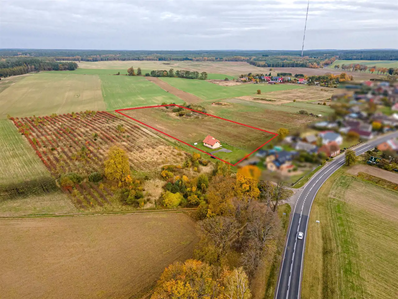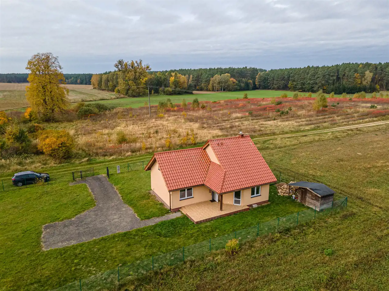 Nieruchomość jest doskonale usytuowana na końcu wsi, co gwarantuje ciszę i spokój. Dzięki dogodnemu położeniu przy drodze krajowej nr 22 dojazd do większych miejscowości jest szybki i wygodny: zaledwie 10 minut jazdy do Tuczna i Człopy oraz 20 minut do Wałcza..