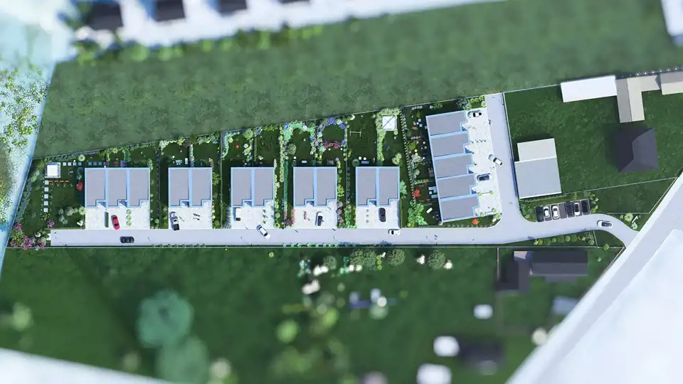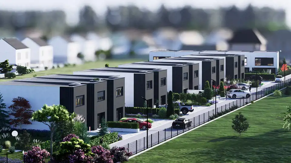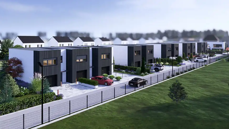Indywidualny projekt jednorodzinnych domów w zabudowie szeregowej, oferuje przestronność i funkcjonalność.