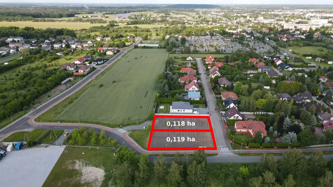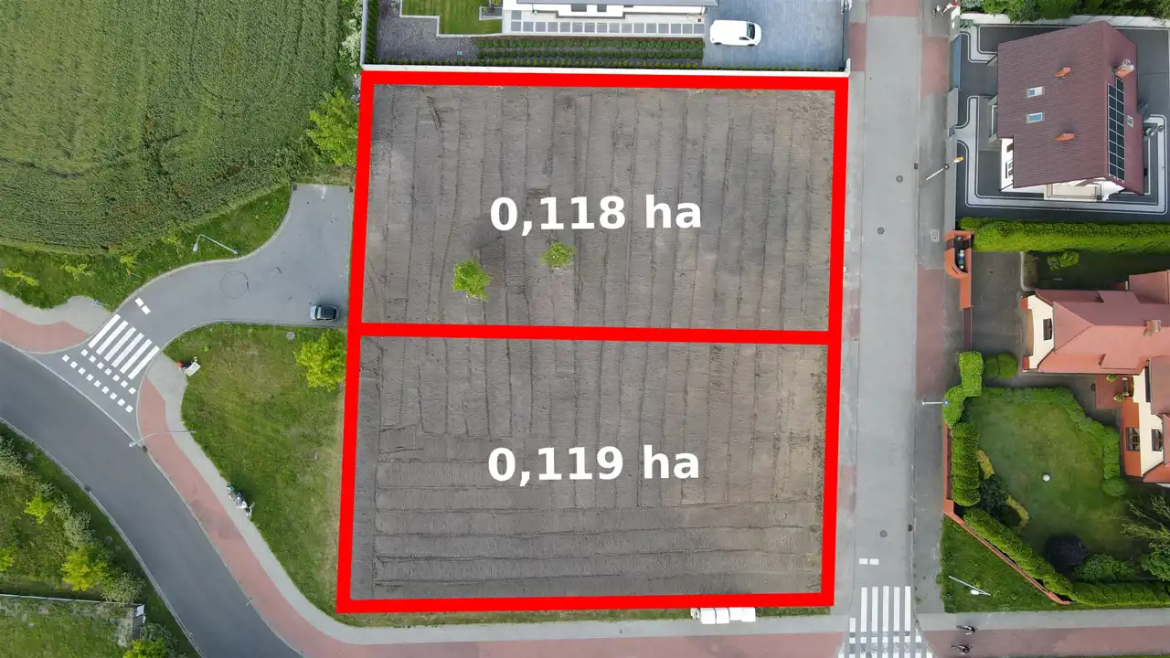 Działka o numerze geodezyjnym 977, o regularnym kształcie prostokąta, położona przy skrzyżowaniu ul. Perłowej i Bursztynowej o powierzchni 1193 m2, wymiary: szerokość działki 25 metrów, długość 47 metrów.