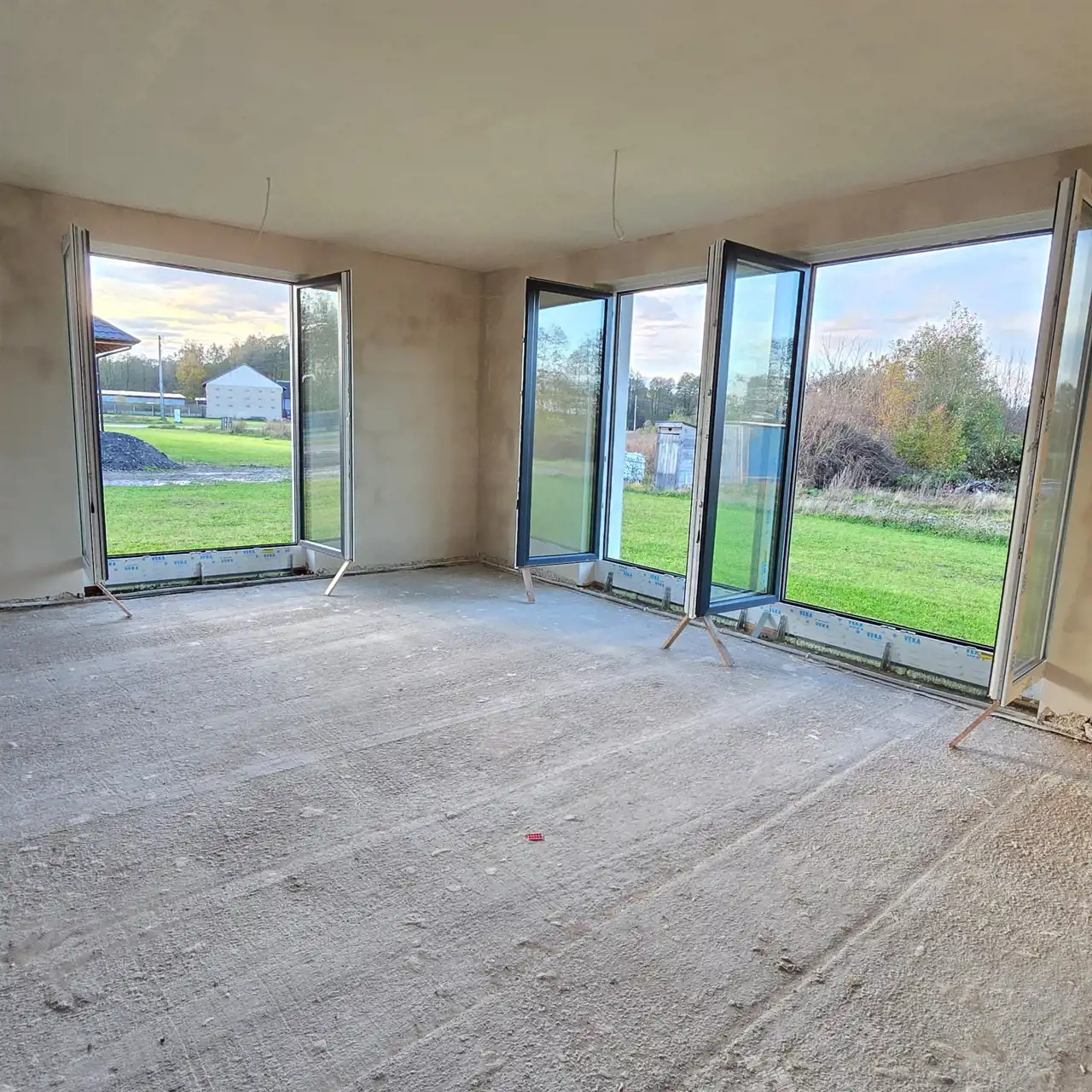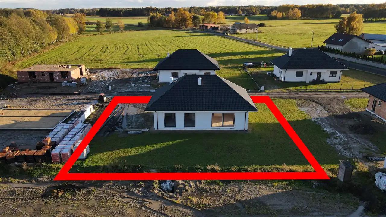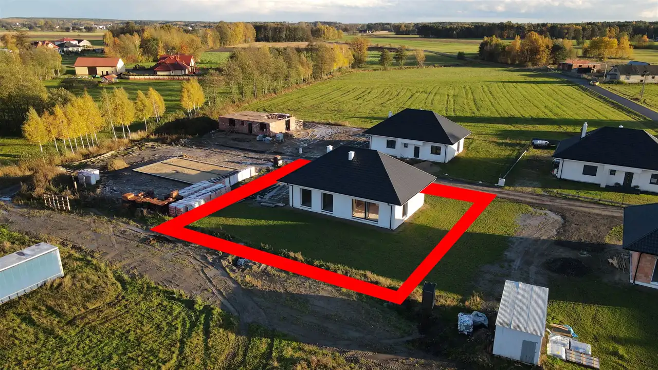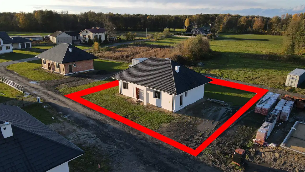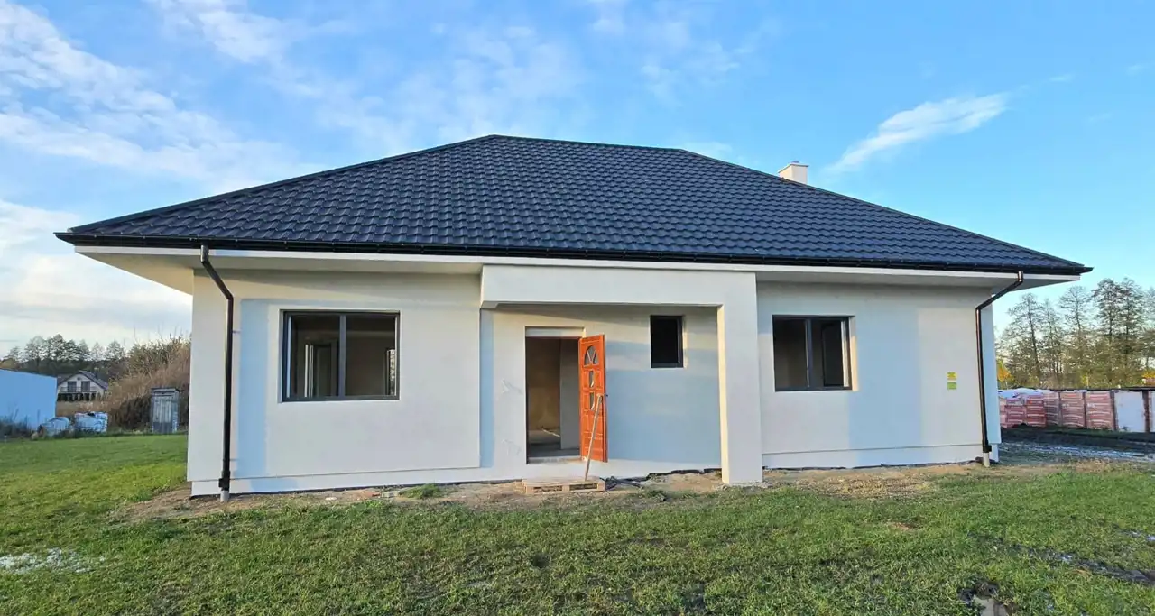 Dach wielospadowy pokryty blachodachówką w kolorze antracytowym wraz z orynnowaniem. Okna PCV 3-szybowe w kolorystyce dachu. Ściany zewnętrzne ocieplone styropianem o grubości 20 cm. Wewnątrz budynku rozprowadzona instalacja elektryczna oraz wykonano tynki gipsowe. Działka nieogrodzona. Do działki doprowadzone media-woda i prąd.
