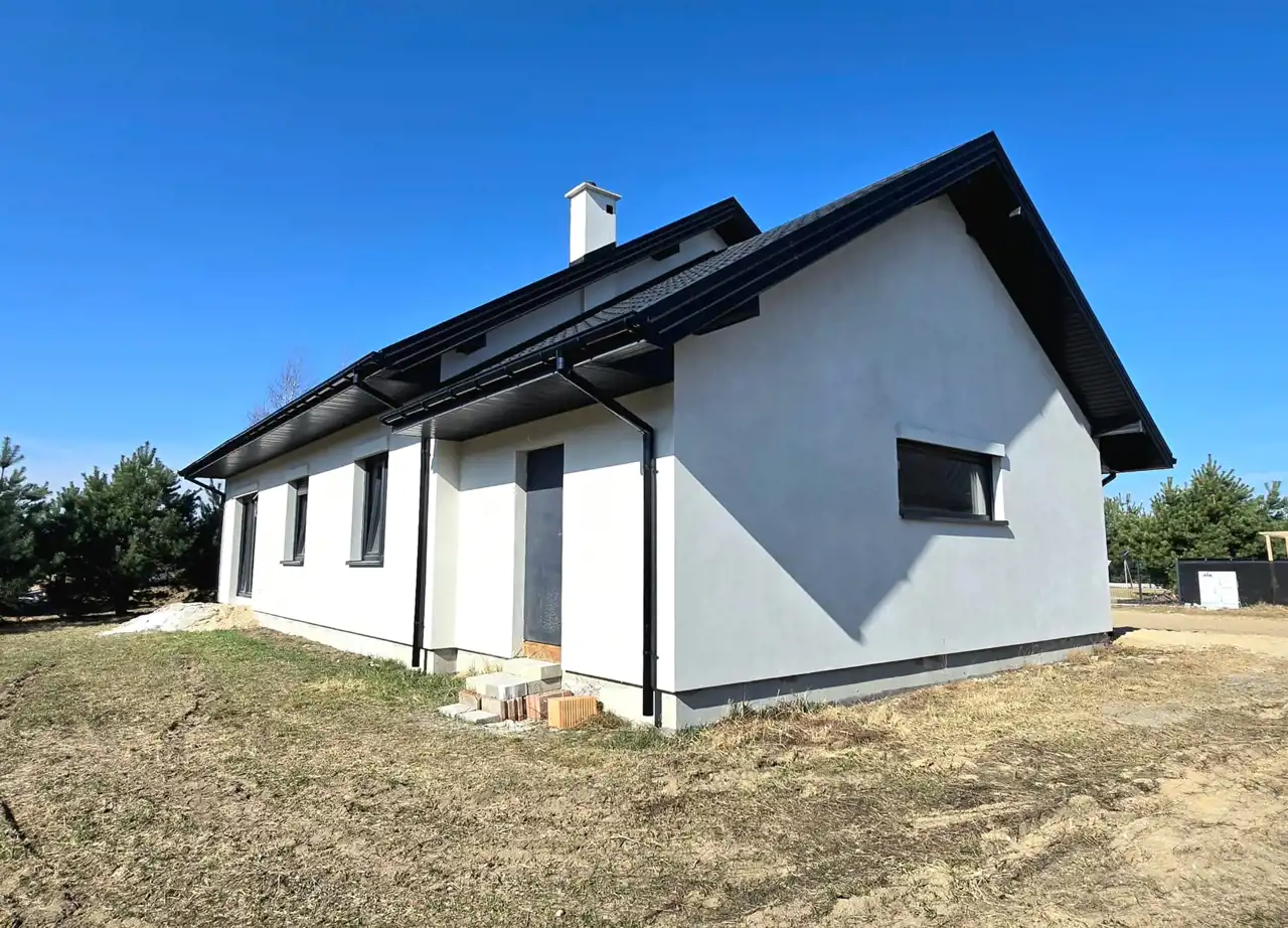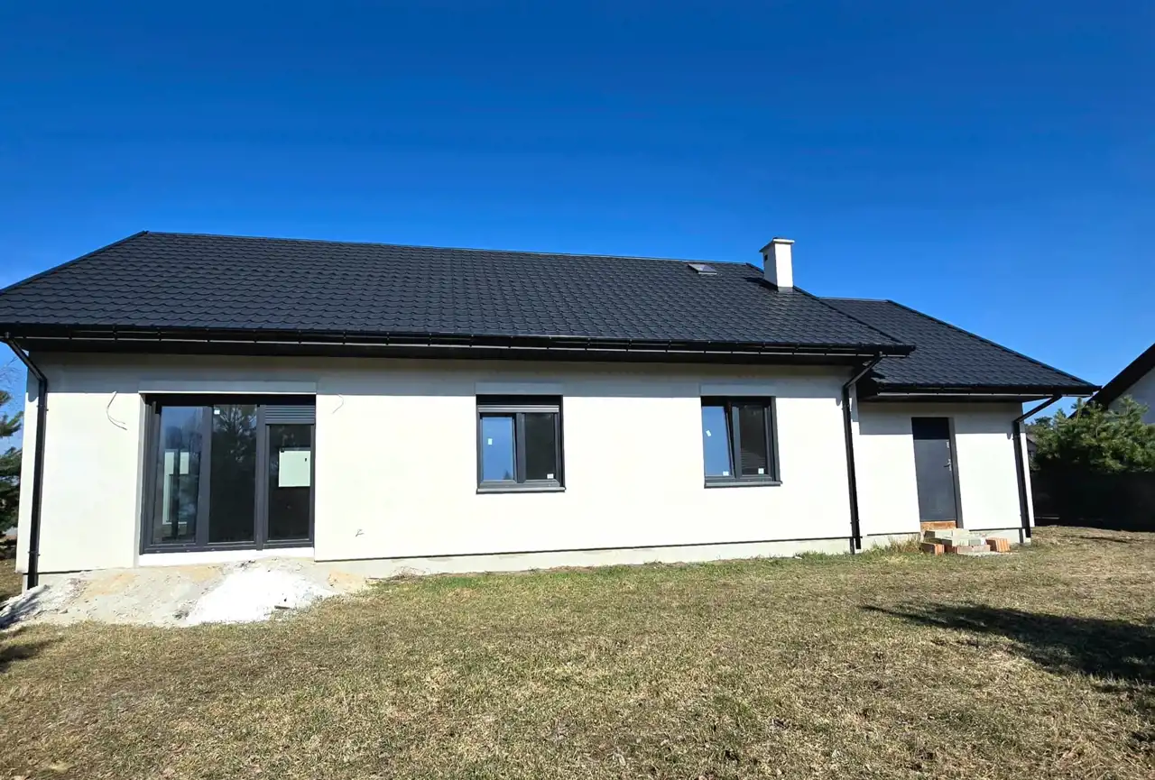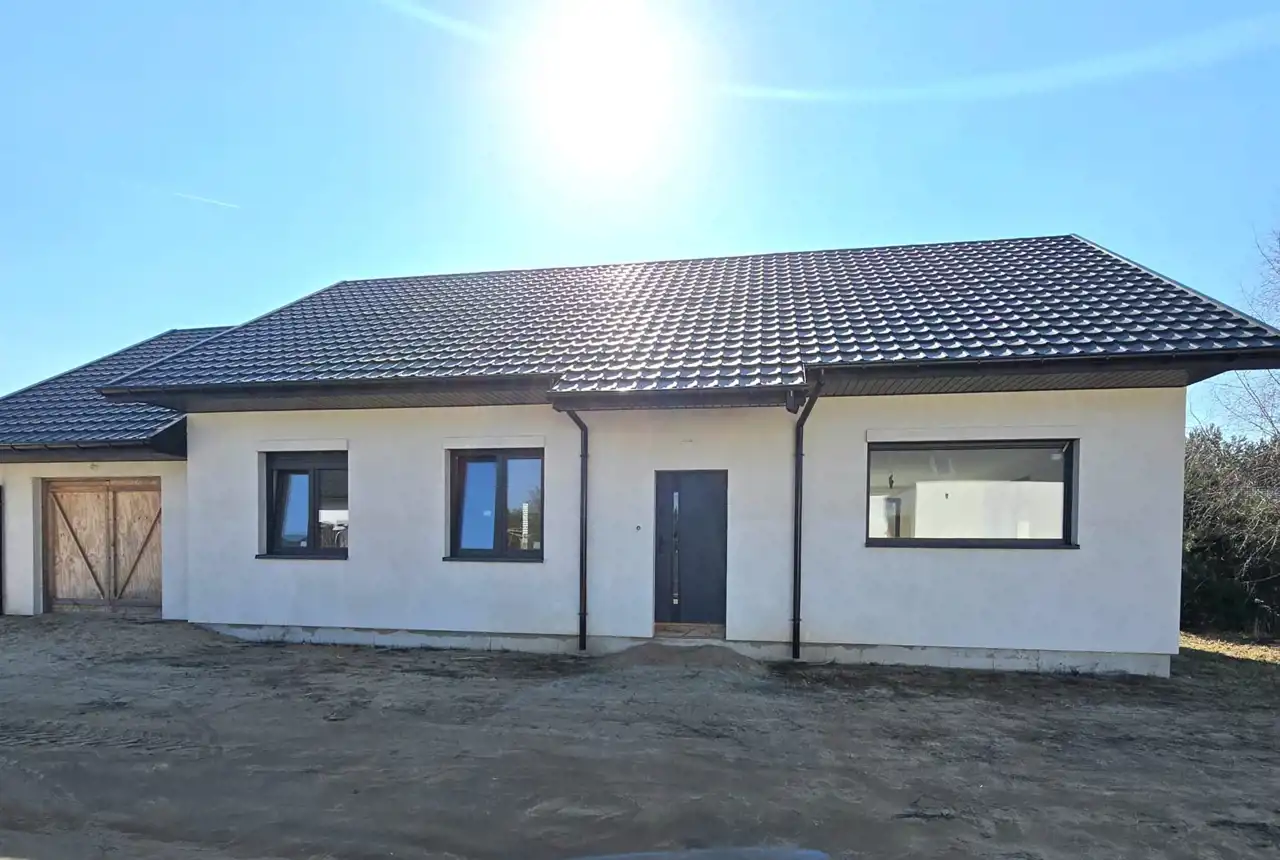 Dom parterowy, wolnostojący, niepodpiwniczony, z garażem w bryle budynku. Dom posiada salon z aneksem kuchennym, 3 pokoje (sypialnie), łazienkę, wc, kotłownię, hall oraz garaż. Łączna powierzchnia użytkowa 130,68㎡ (w tym mieszkalna 101,52㎡). Wewnątrz wykonano instalację elektryczną, doprowadzono wodę do budynku oraz rozprowadzona została instalacja kanalizacyjna. Ponadto wykonano w każdym pomieszczeniu wyprowadzenia do rekuperacji. Na ścianach położone zostały tynki gipsowe, a w łazience i WC tynki cementowo-wapienne. Dach wielospadowy pokryty blachodachówką w kolorze antracytowym. Okna PCV 3-szybowe z roletami w kolorystyce dachu. Ściany zewnętrzne ocieplone styropianem o grubości 20 cm. Brama garażowa w kolorze antracytowym zostanie zamontowana przed przeniesieniem własności i została wliczona w cenę ofertową. Na całości budynku strop żelbetowy.