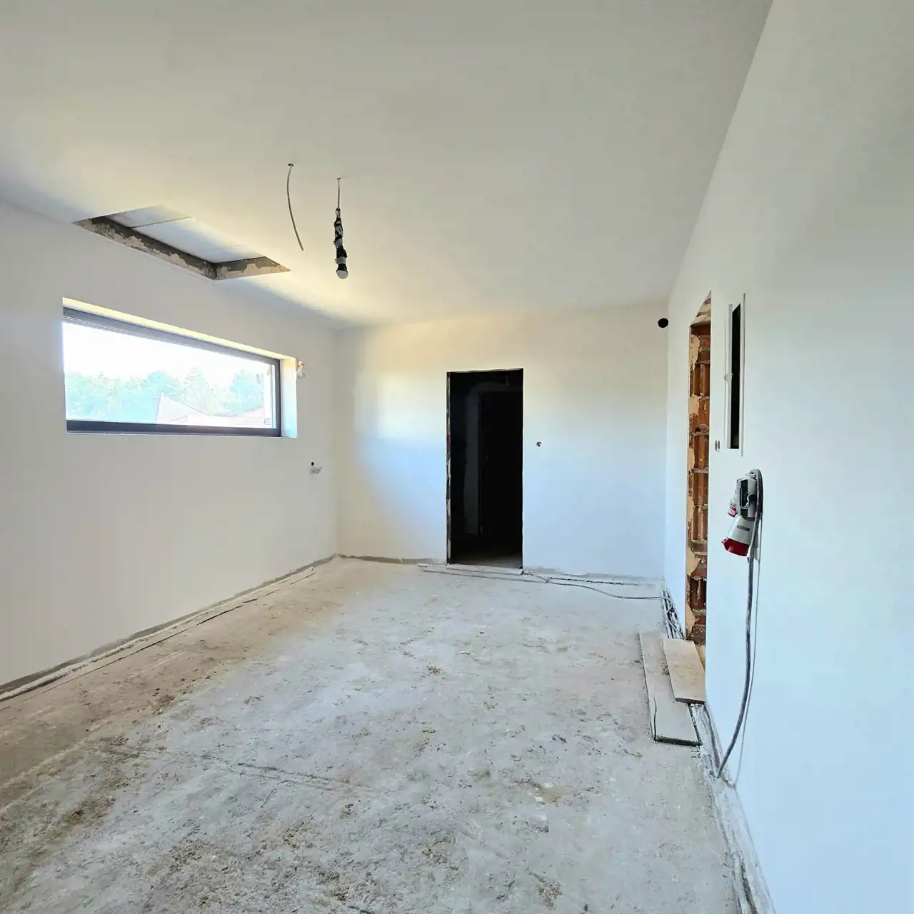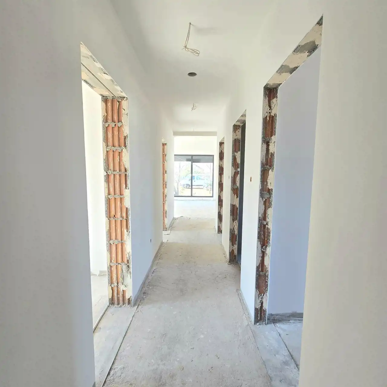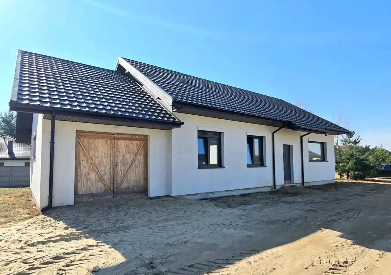 Dom parterowy, wolnostojący, niepodpiwniczony, z garażem w bryle budynku. Dom posiada salon z aneksem kuchennym, 3 pokoje (sypialnie), łazienkę, wc, kotłownię, hall oraz garaż. Łączna powierzchnia użytkowa 130,68㎡ (w tym mieszkalna 101,52㎡). Wewnątrz wykonano instalację elektryczną, doprowadzono wodę do budynku oraz rozprowadzona została instalacja kanalizacyjna. Ponadto wykonano w każdym pomieszczeniu wyprowadzenia do rekuperacji. Na ścianach położone zostały tynki gipsowe, a w łazience i WC tynki cementowo-wapienne. Dach wielospadowy pokryty blachodachówką w kolorze antracytowym. Okna PCV 3-szybowe z roletami w kolorystyce dachu. Ściany zewnętrzne ocieplone styropianem o grubości 20 cm. Brama garażowa w kolorze antracytowym zostanie zamontowana przed przeniesieniem własności i została wliczona w cenę ofertową. Na całości budynku strop żelbetowy.