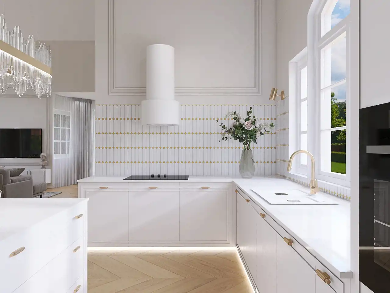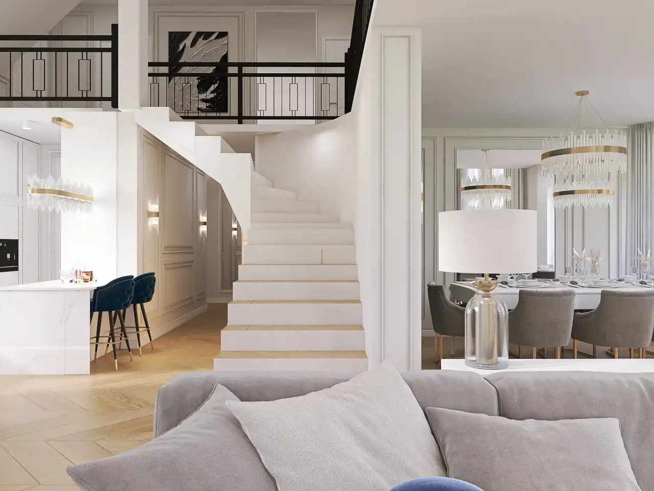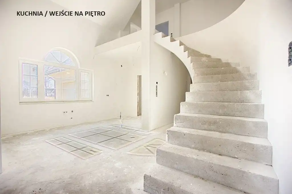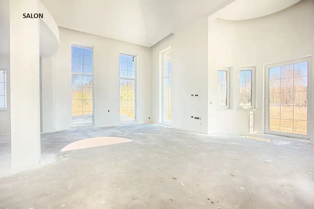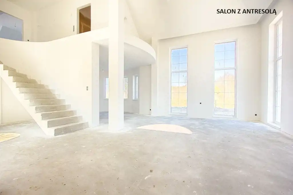 Otwarta przestrzeń w kuchni i salonie to zasługa antresoli oraz sufitu w stylu katedralnym. Niestandardowa wysokość parteru (ok. 6 m) to rozwiązanie idealne na instalację efektownych przeszkleń lub prywatną galerię sztuki. To również duże możliwości aranżacyjne, dobry mikroklimat oraz wyjątkowe poczucie przestrzeni. Na zdjęciach załączono wstępne projekty wnętrza. Przemyślany i optymalny układ przestrzenny willi cechuje się otwartością pomieszczeń oraz ich funkcjonalnym połączeniem. Ściany gotowe do pokrycia farbami w gustownych barwach.
