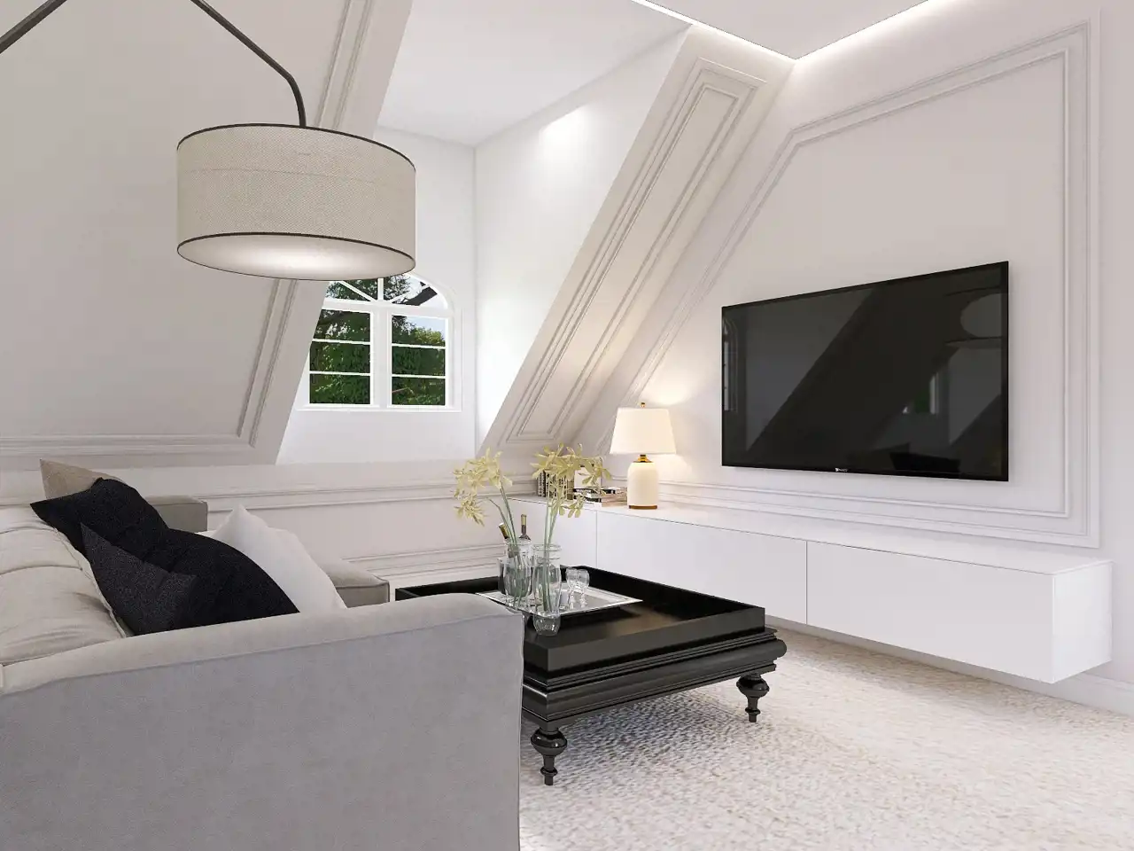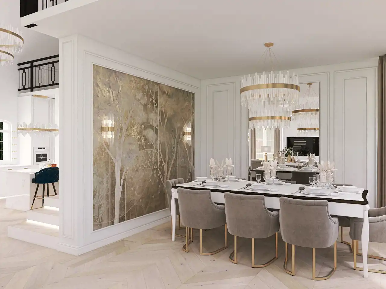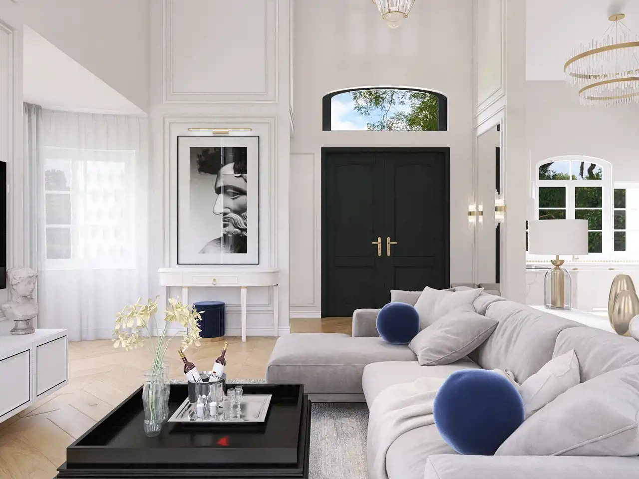 Otwarta przestrzeń w kuchni i salonie to zasługa antresoli oraz sufitu w stylu katedralnym. Niestandardowa wysokość parteru (ok. 6 m) to rozwiązanie idealne na instalację efektownych przeszkleń lub prywatną galerię sztuki. To również duże możliwości aranżacyjne, dobry mikroklimat oraz wyjątkowe poczucie przestrzeni. Na zdjęciach załączono wstępne projekty wnętrza. Przemyślany i optymalny układ przestrzenny willi cechuje się otwartością pomieszczeń oraz ich funkcjonalnym połączeniem. Ściany gotowe do pokrycia farbami w gustownych barwach.