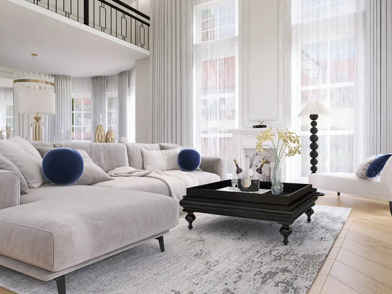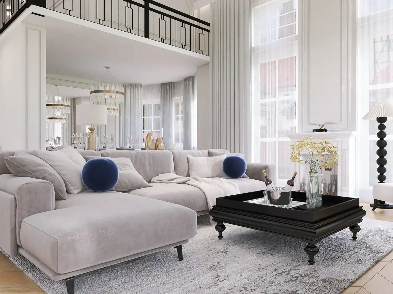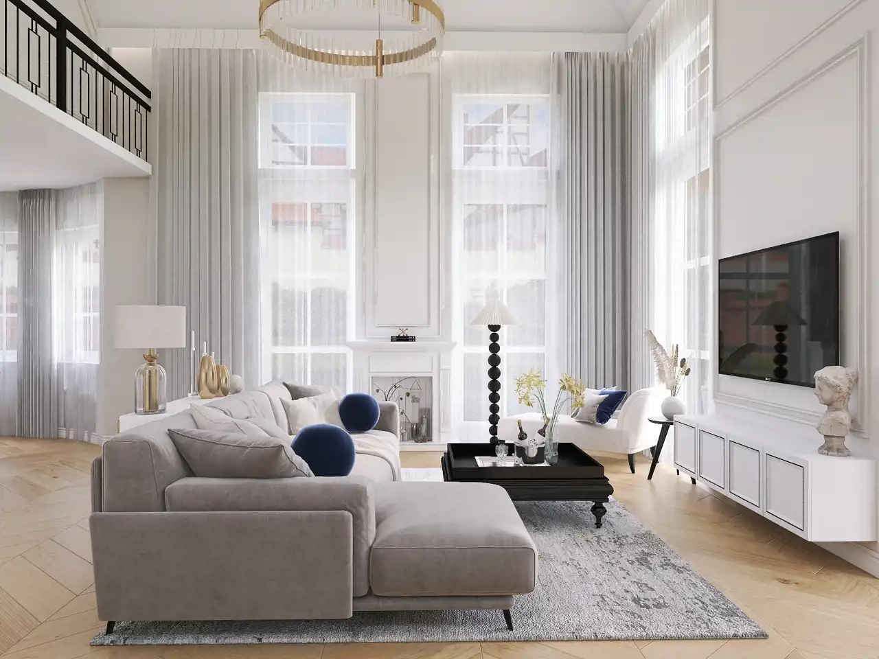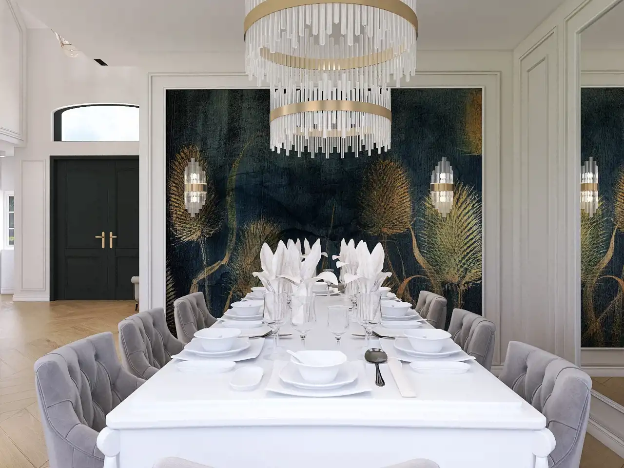 Otwarta przestrzeń w kuchni i salonie to zasługa antresoli oraz sufitu w stylu katedralnym. Niestandardowa wysokość parteru (ok. 6 m) to rozwiązanie idealne na instalację efektownych przeszkleń lub prywatną galerię sztuki. To również duże możliwości aranżacyjne, dobry mikroklimat oraz wyjątkowe poczucie przestrzeni. Na zdjęciach załączono wstępne projekty wnętrza. Przemyślany i optymalny układ przestrzenny willi cechuje się otwartością pomieszczeń oraz ich funkcjonalnym połączeniem. Ściany gotowe do pokrycia farbami w gustownych barwach.