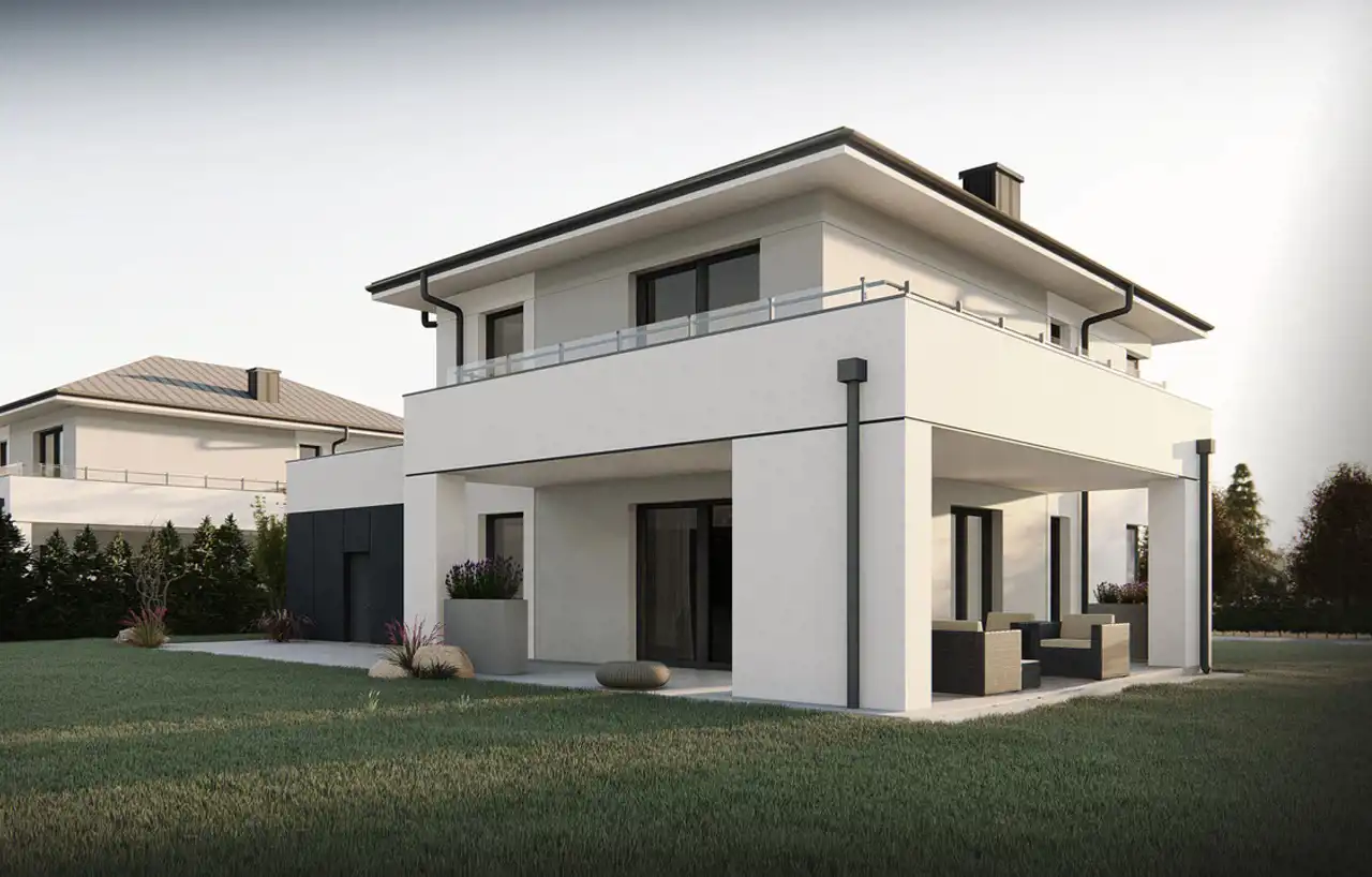 Dach – konstrukcja Wielospadowy, pokryty blachą na „click” w kolorze grafitowym.