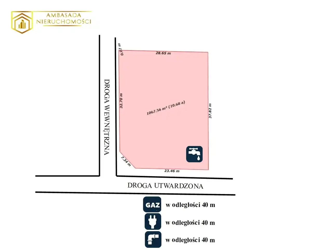 - Media Woda: jest; Kanalizacja: brak; Prąd: jest; Gaz: jest