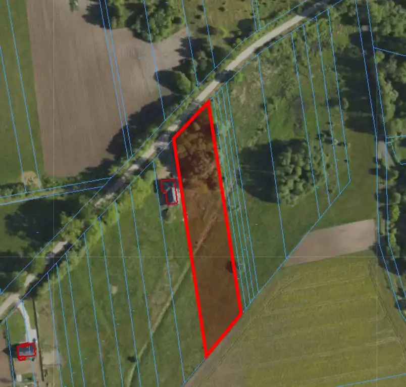 - Działka o kształcie zbliżonym do prostokąta, długości ok. 185 mb. i szerokości ok. 40 mb,