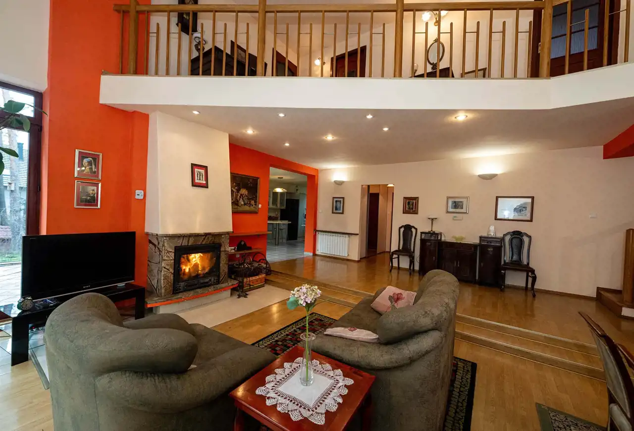 duży, wysoki salon z kominkiem (płaszcz wodny)