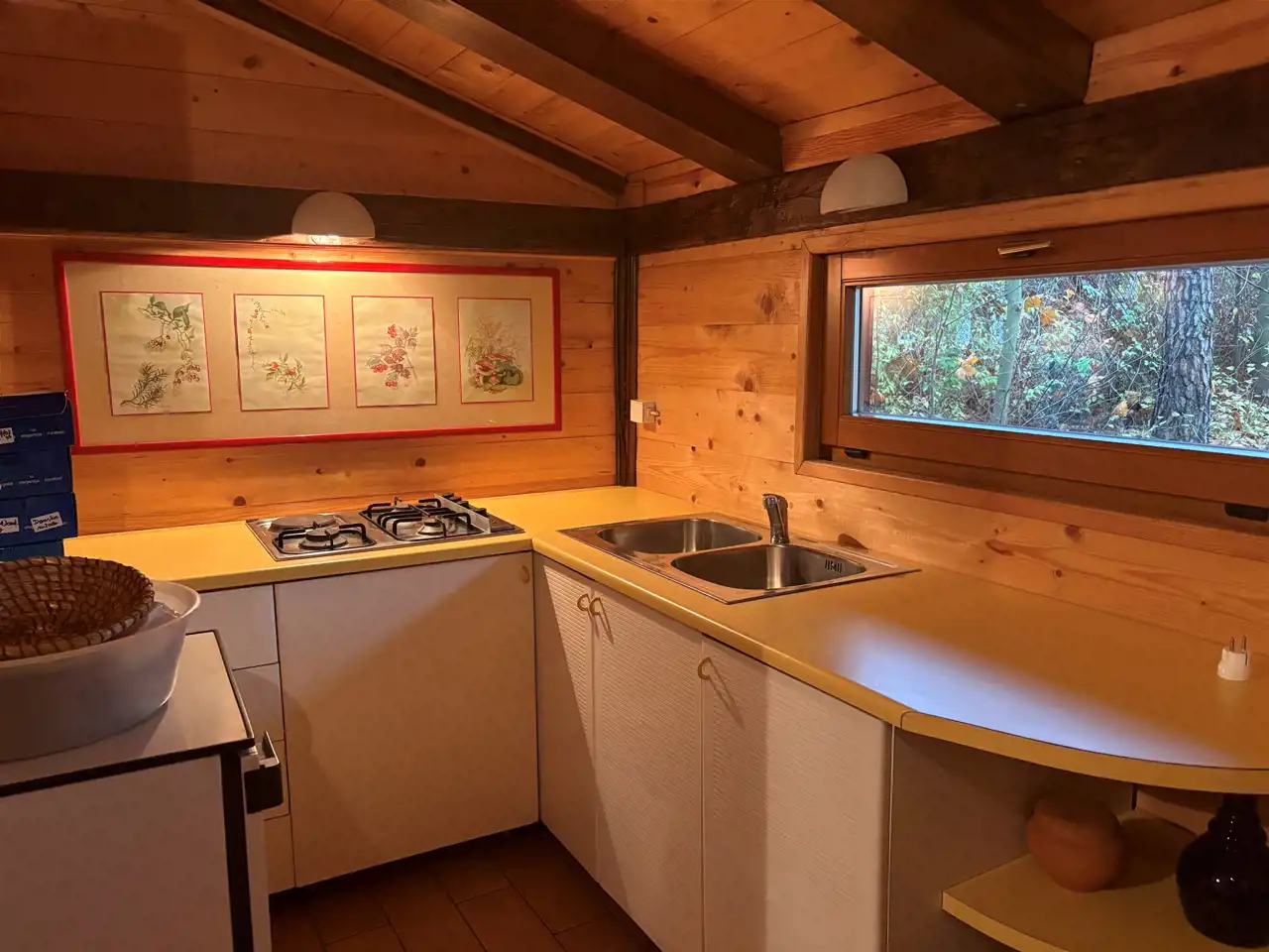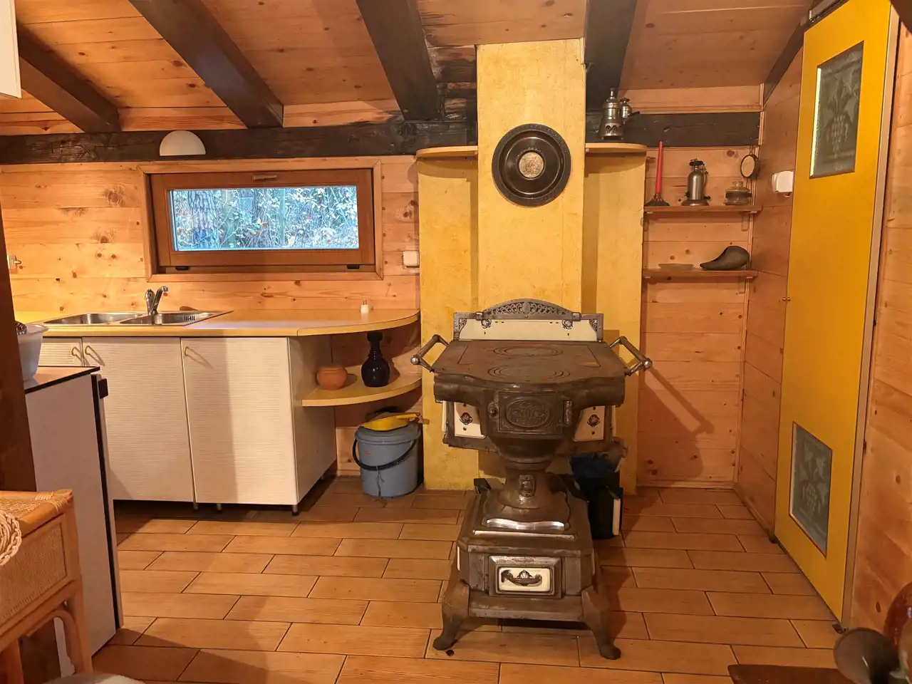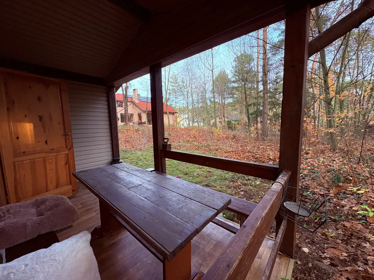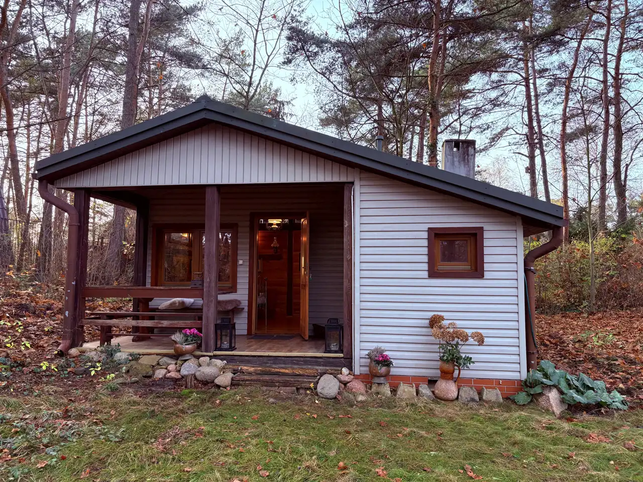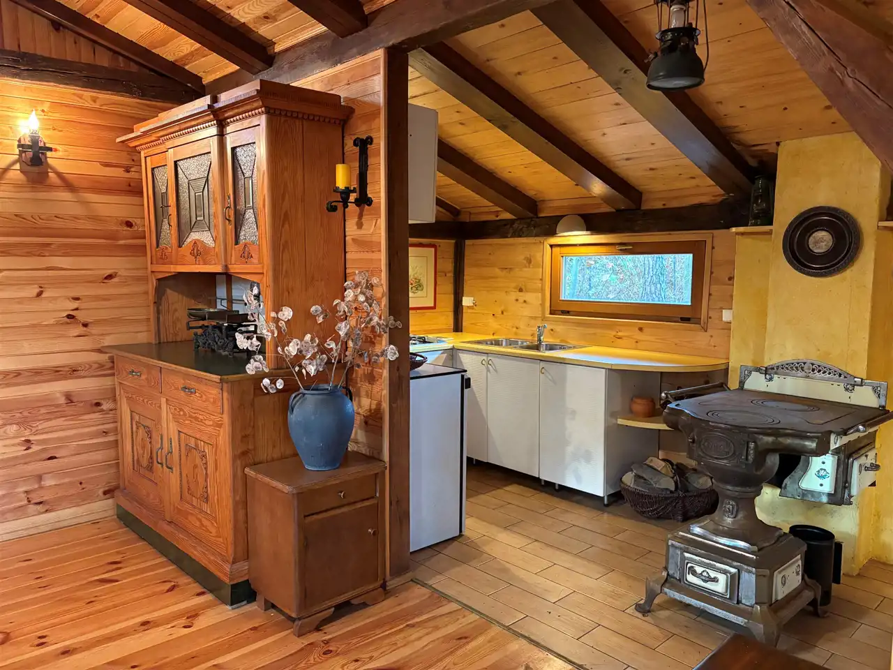 Dom został wykończony z dużą dbałością o klimat leśnej, przytulnej chaty. Wnętrze zdobią liczne elementy drewniane oraz antyczne dodatki, tworzące wyjątkowy, rustykalny nastrój.