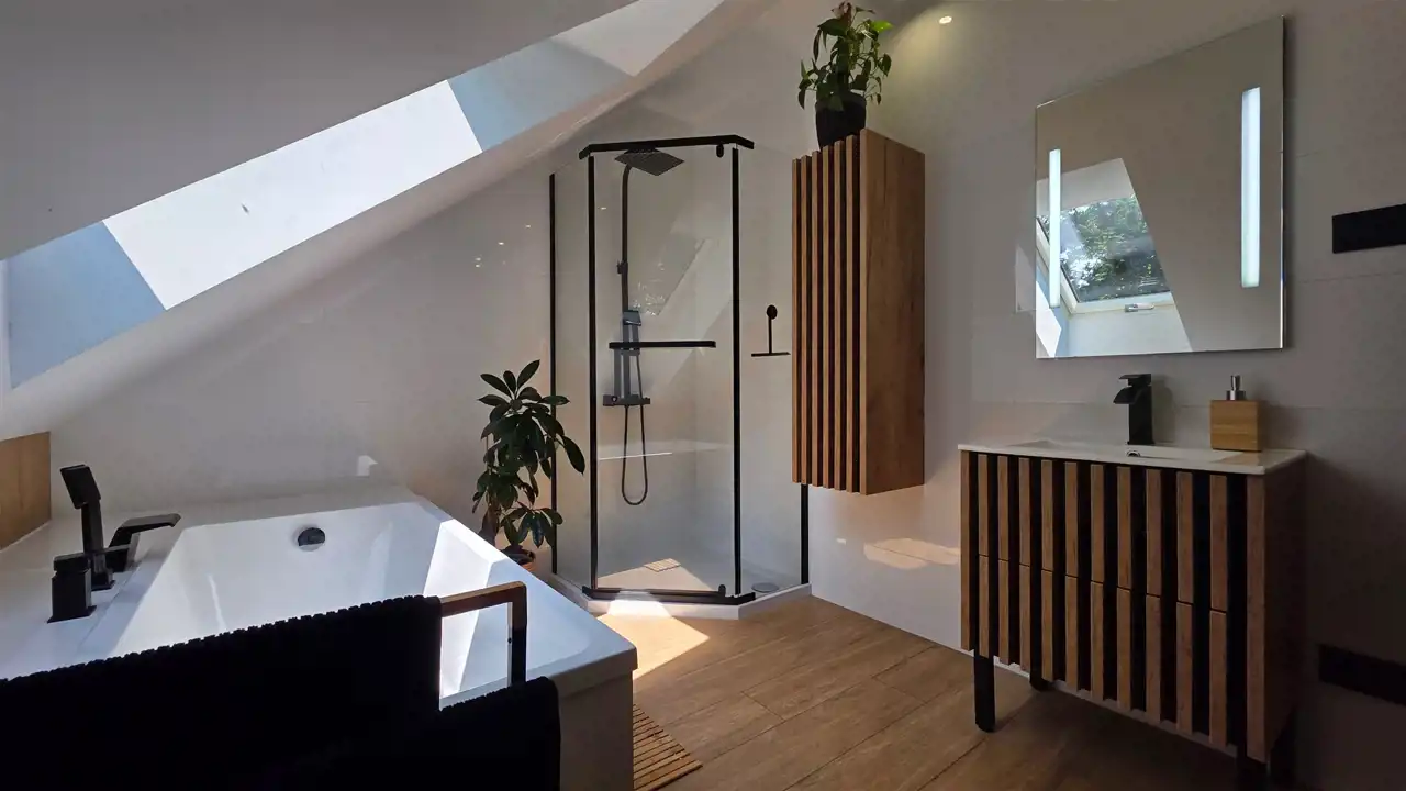 Dom parterowy z użytkowym poddaszem oraz garażem dla 2 samochodów (194 m2) i wiatą posadowiony na zagospodarowanej działce leśnej (1010 m2).