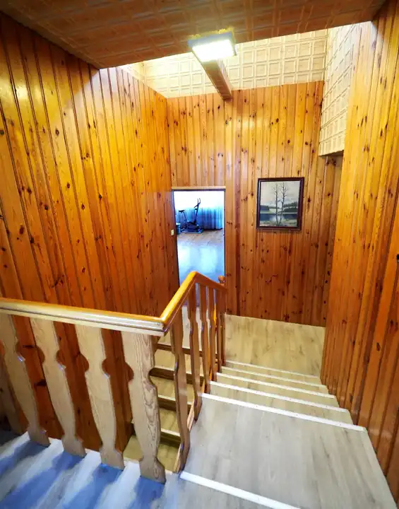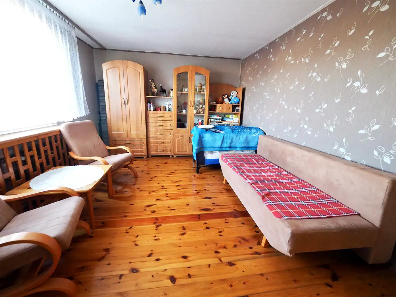 - Stolarka okienna PCV, rolety zewnętrzne w dwóch pokojach; stolarka drzwiowa mieszana - część drewniana, część z płyty. Posadzka płytki , panele, deski. Ściany otynkowane i malowane, boazeria.