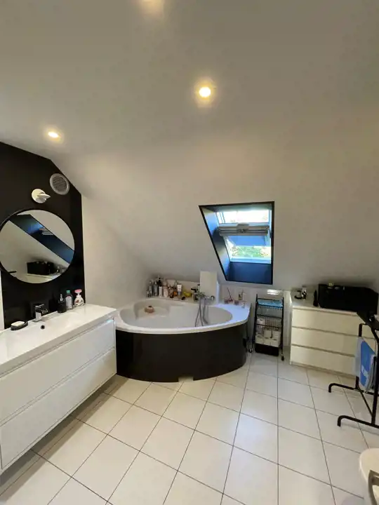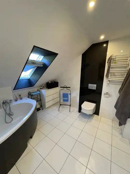 Elegancki pokój kąpielowy z wanną, idealny do relaksu po ciężkim dniu,