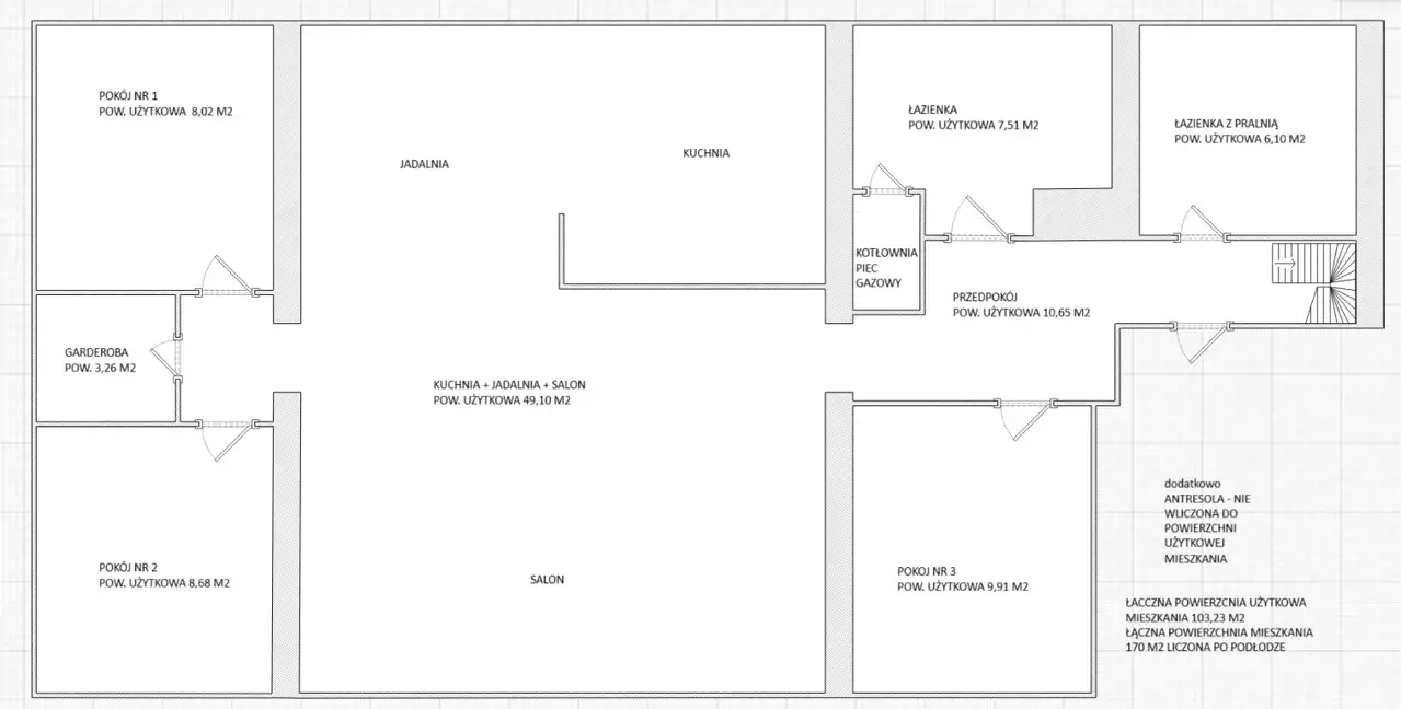 Całkowita powierzchnia mieszkania to około 170 m2, powierzchnia użytkowa 103,23m2.