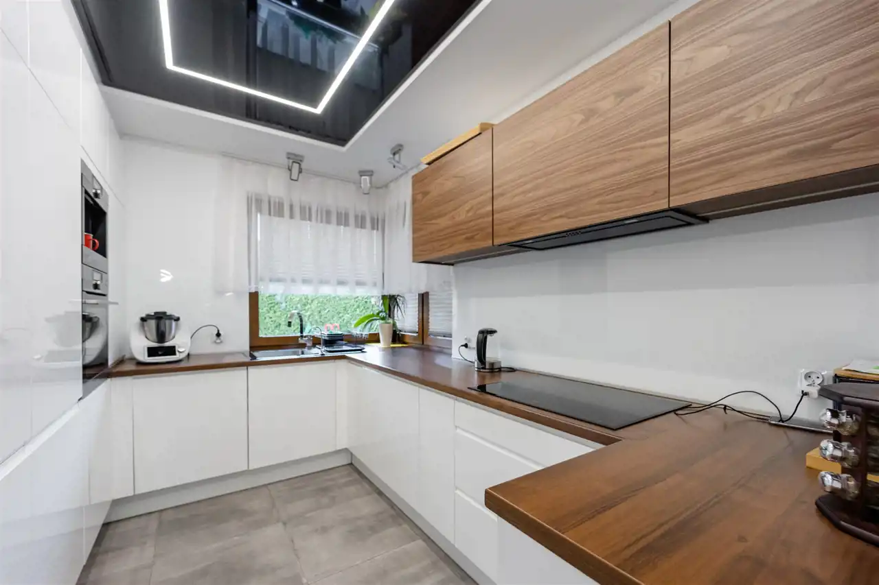 Na parterze znajduje się duży, przestronny salon z funkcjonalną kuchnią, sypialnia / gabinet, łazienka, spiżarka, pom. techniczne oraz garaż;