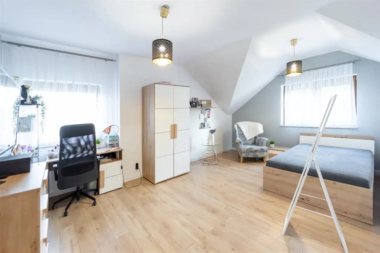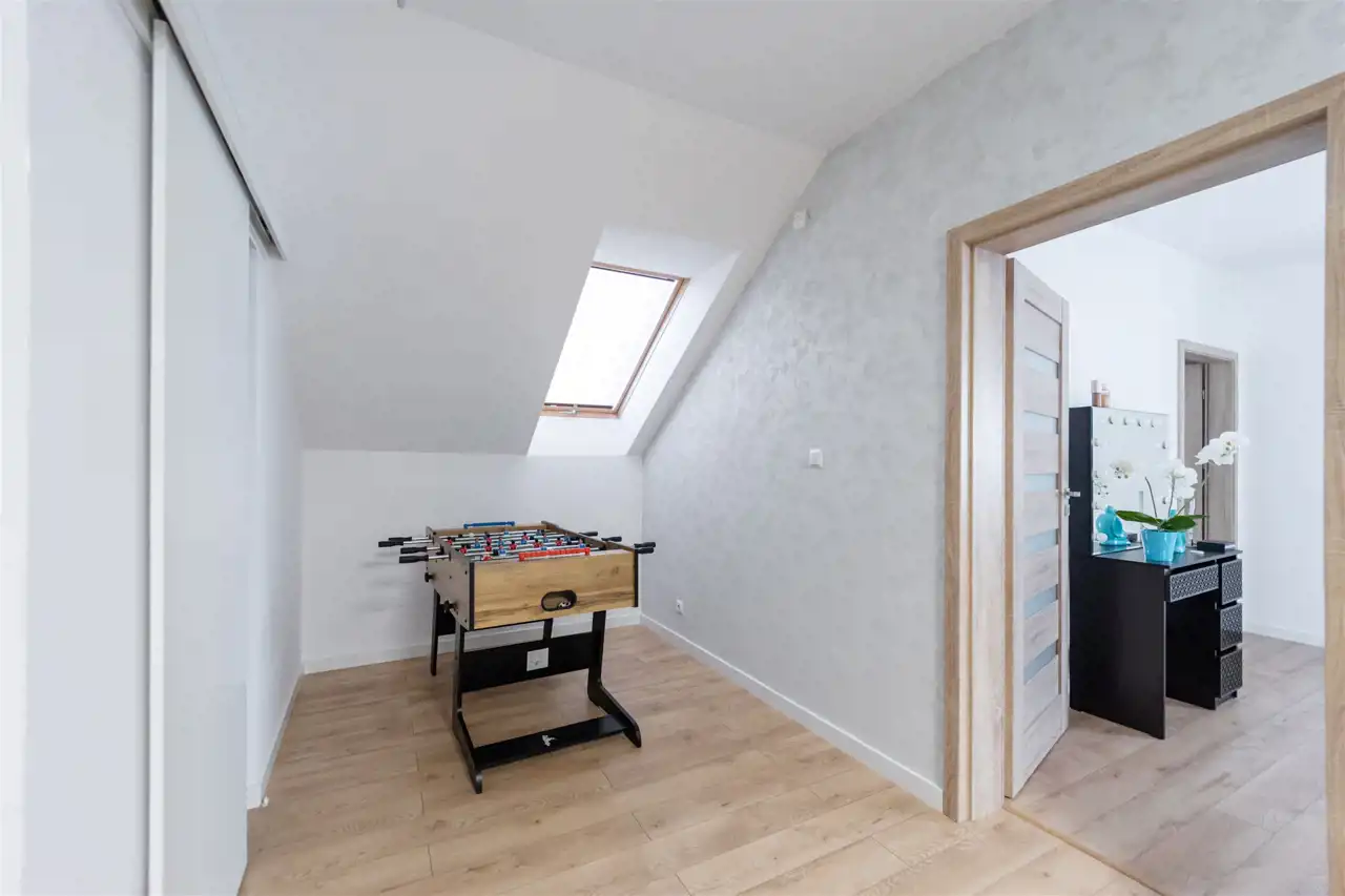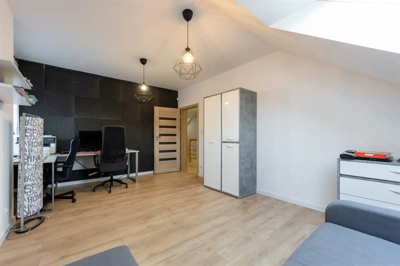 Na piętrze: 3x sypialnie (w tym jedna z garderobą), duża łazienka oraz schowek.