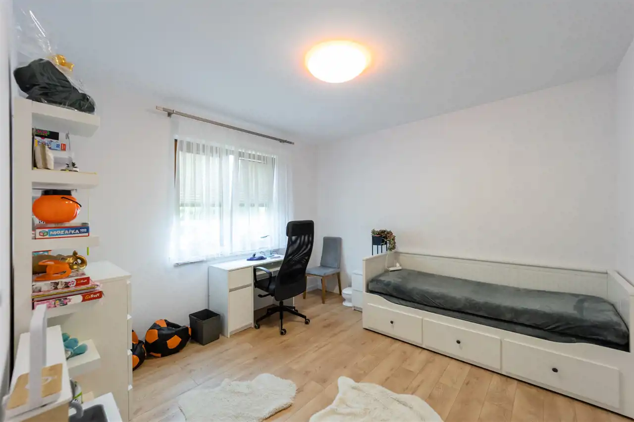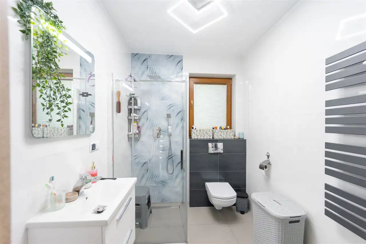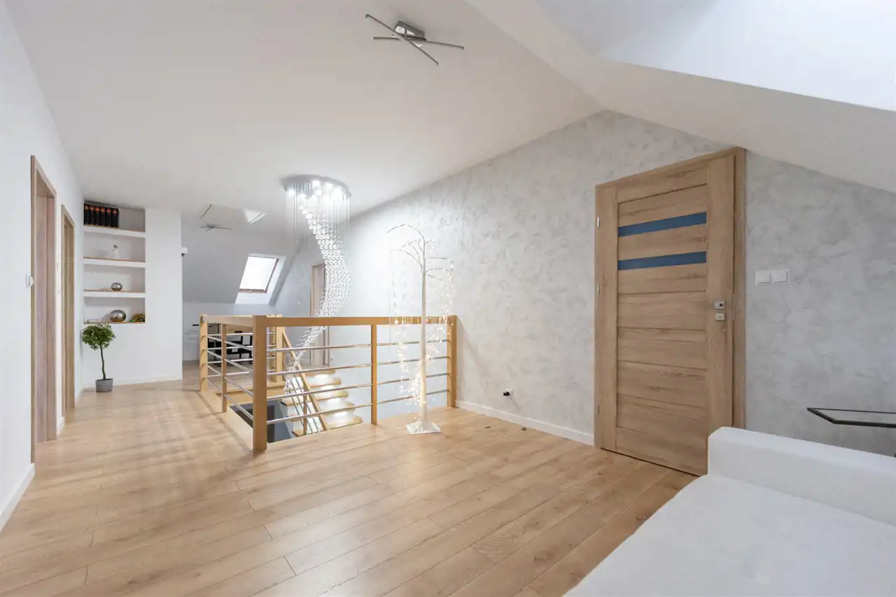 Na piętrze: 3x sypialnie (w tym jedna z garderobą), duża łazienka oraz schowek.