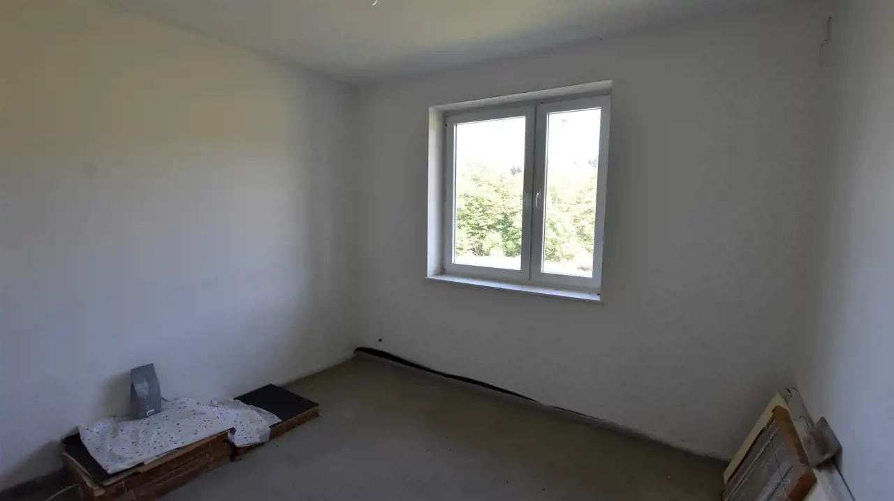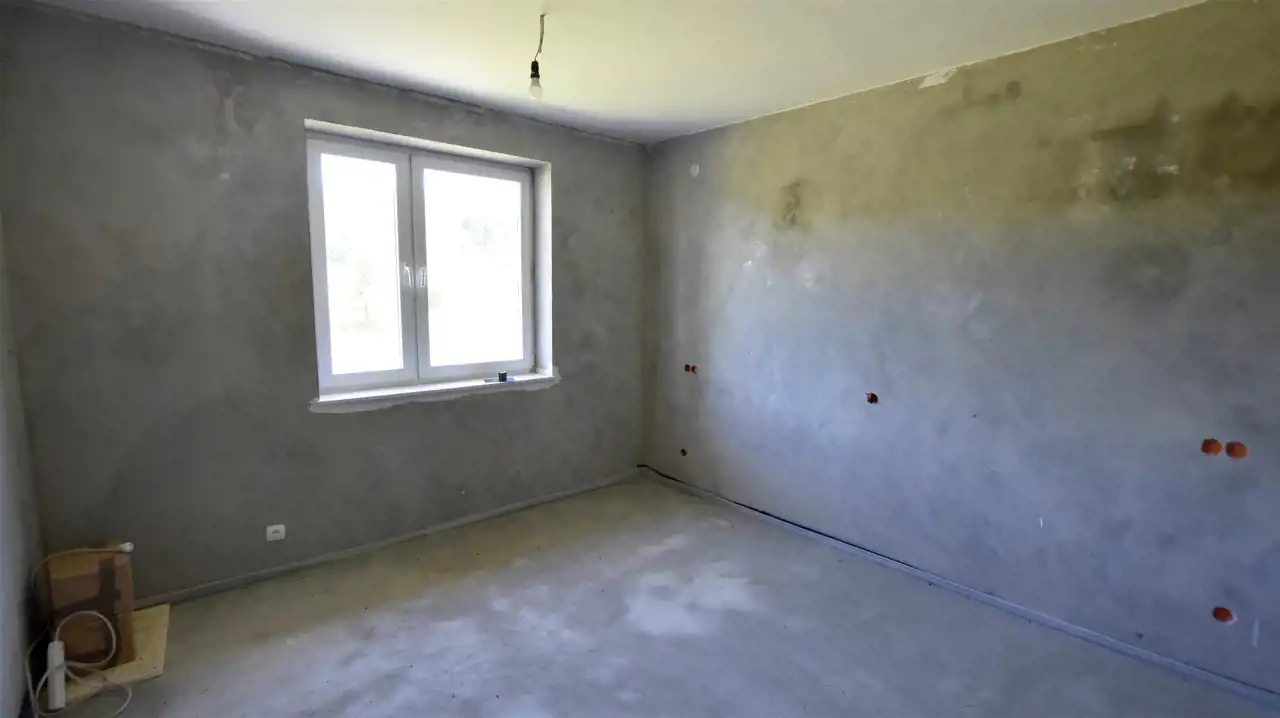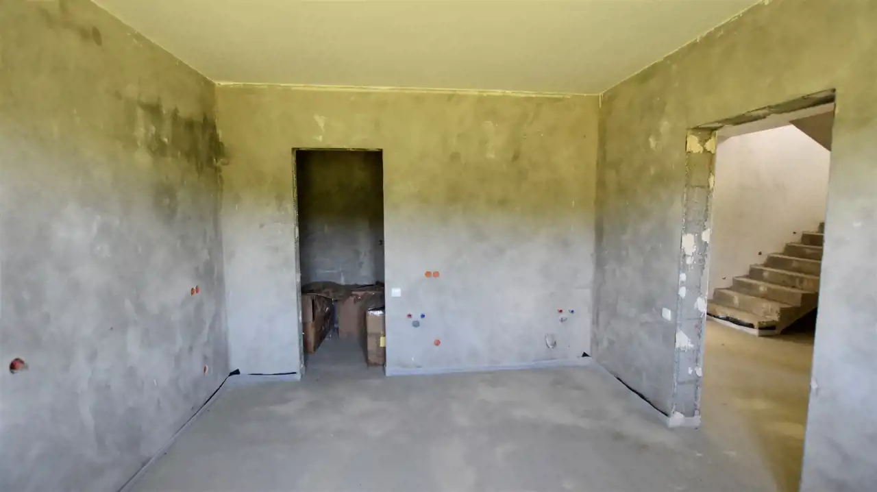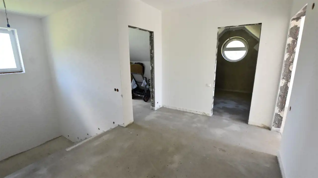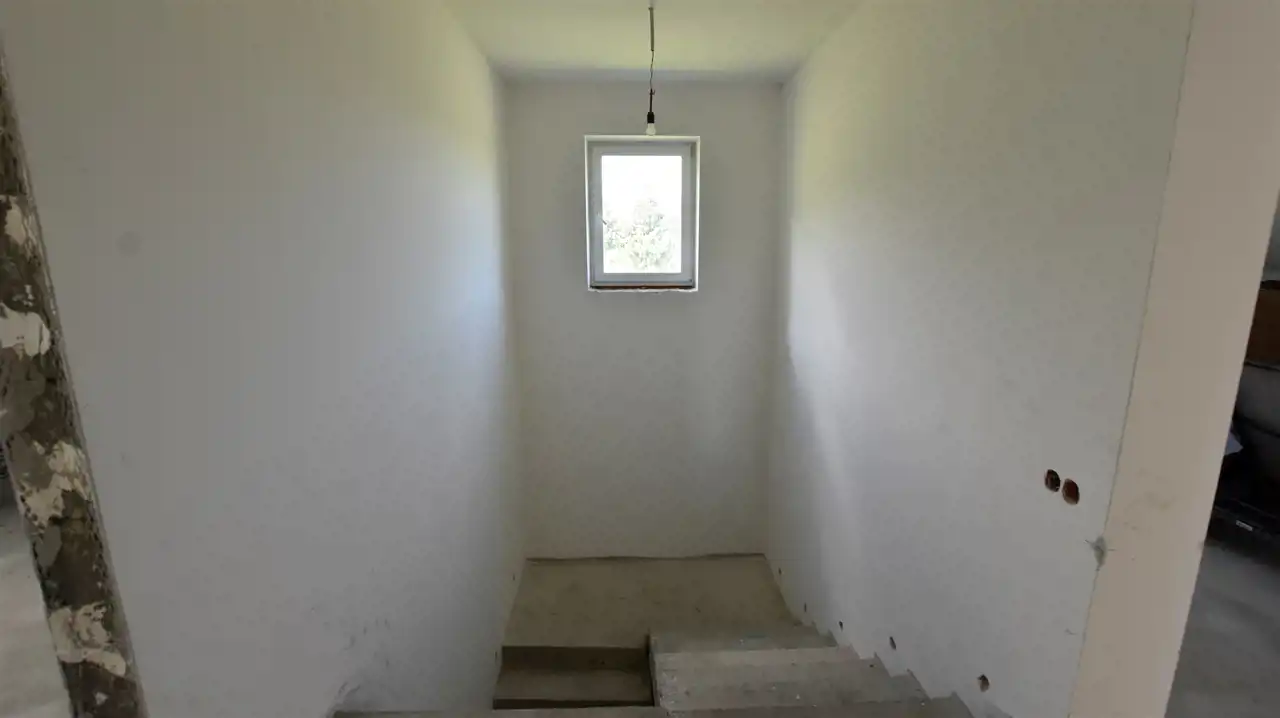 Budynek wybudowany z pustaka, ocieplony styropianem, pokrycie dachowe blacho dachówka wraz z podbitką dachową, okna plastikowe w kolorze białym. Wykonano parapety zewnętrzne. Wewnątrz wykonana została elektryka, sieć wodno-kanalizacyjna, tynki. Budynek posiada wykonane odwodnienie. Balkony na poddaszu wykończone zostały gresem, wokół budynku wykonana została kostka wraz z podjazdem do garażu. Na schodach wyprowadzone jest podświetlenie oraz zamontowane zostało okno, które dodatkowo doświetla wnętrze. Do wykonania jest ogrzewanie, które dopasować można do własnych potrzeb.